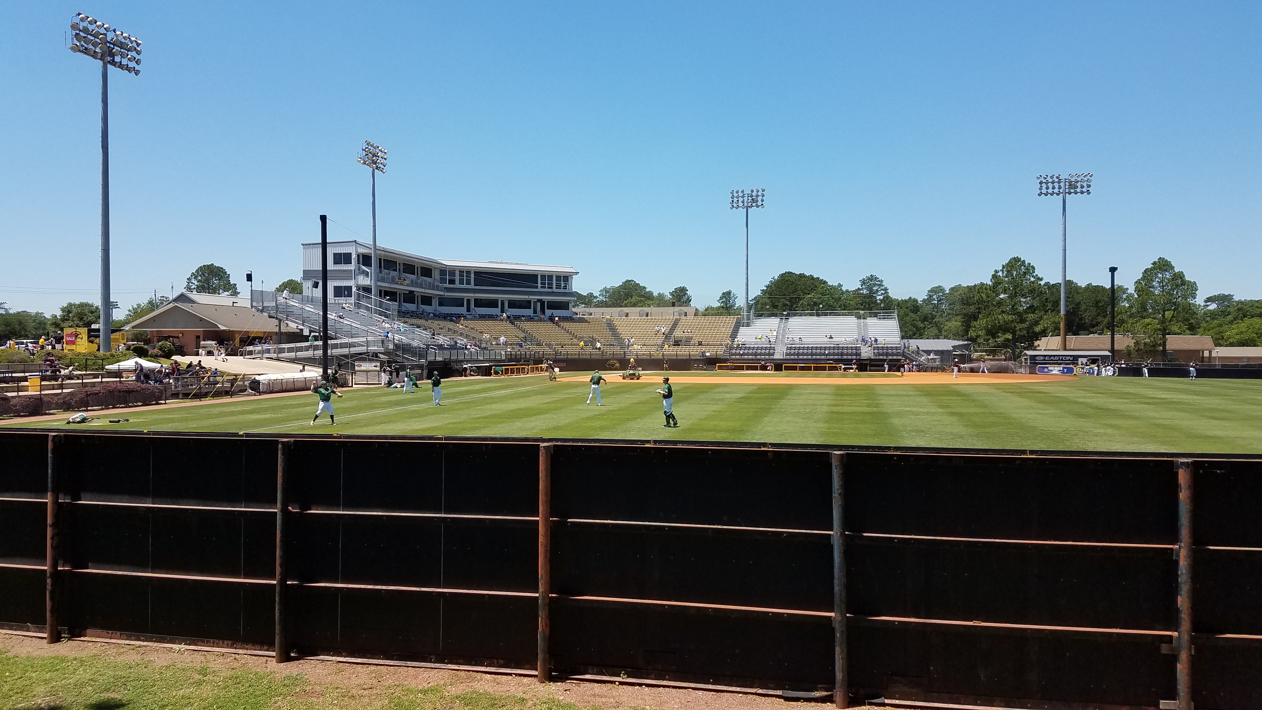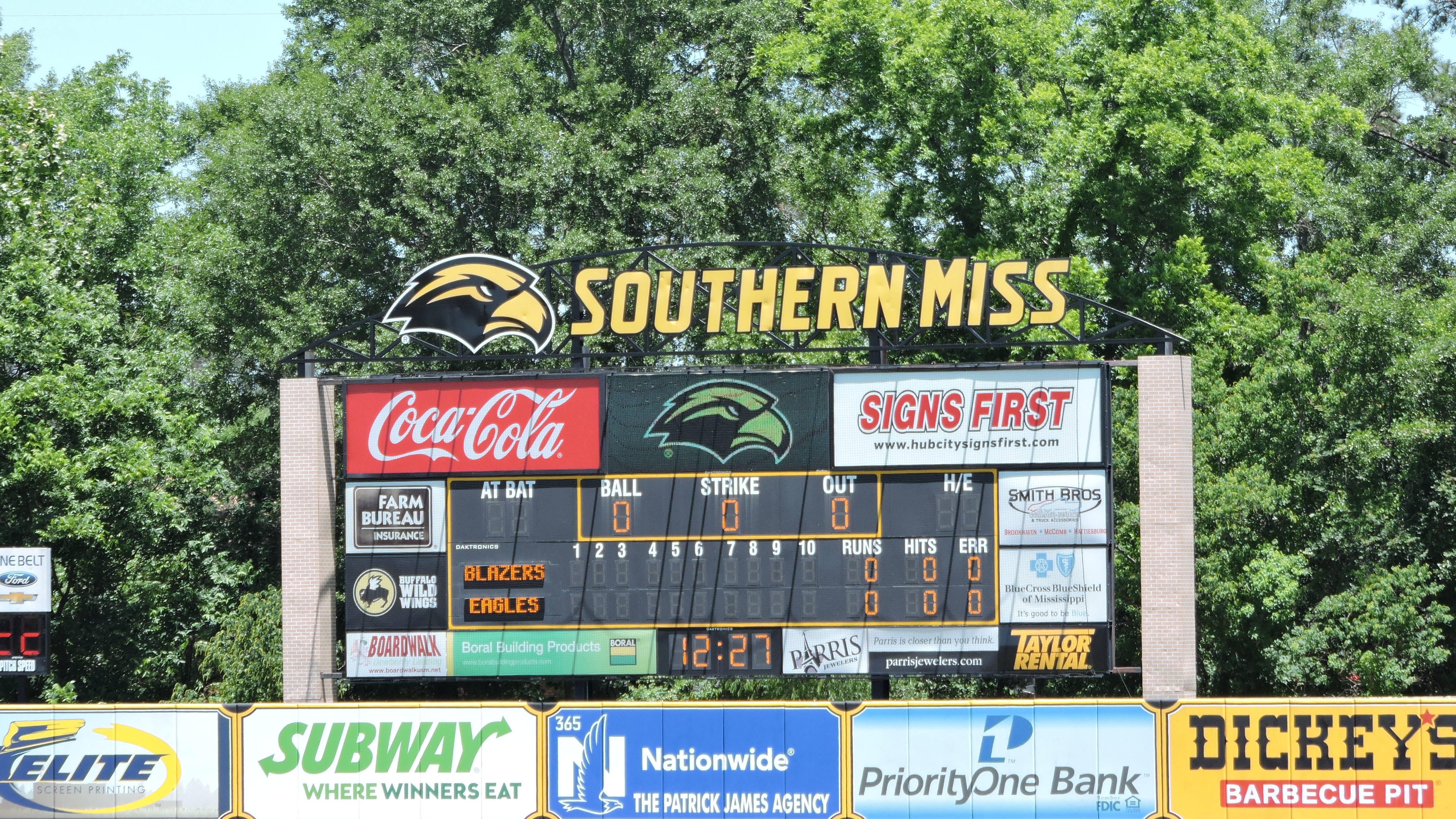 In left-center, pointed towards home plate is an adequate scoreboard based in black. The top of the board says “Southern Miss” with an eagle logo accompanying the wordmark. There are a couple of ads on the fringes of the board and near the center is a digital screen, which is so small that it takes a little while to recognize what it is. The graphics utilized on it during the game did give a little life to the board.