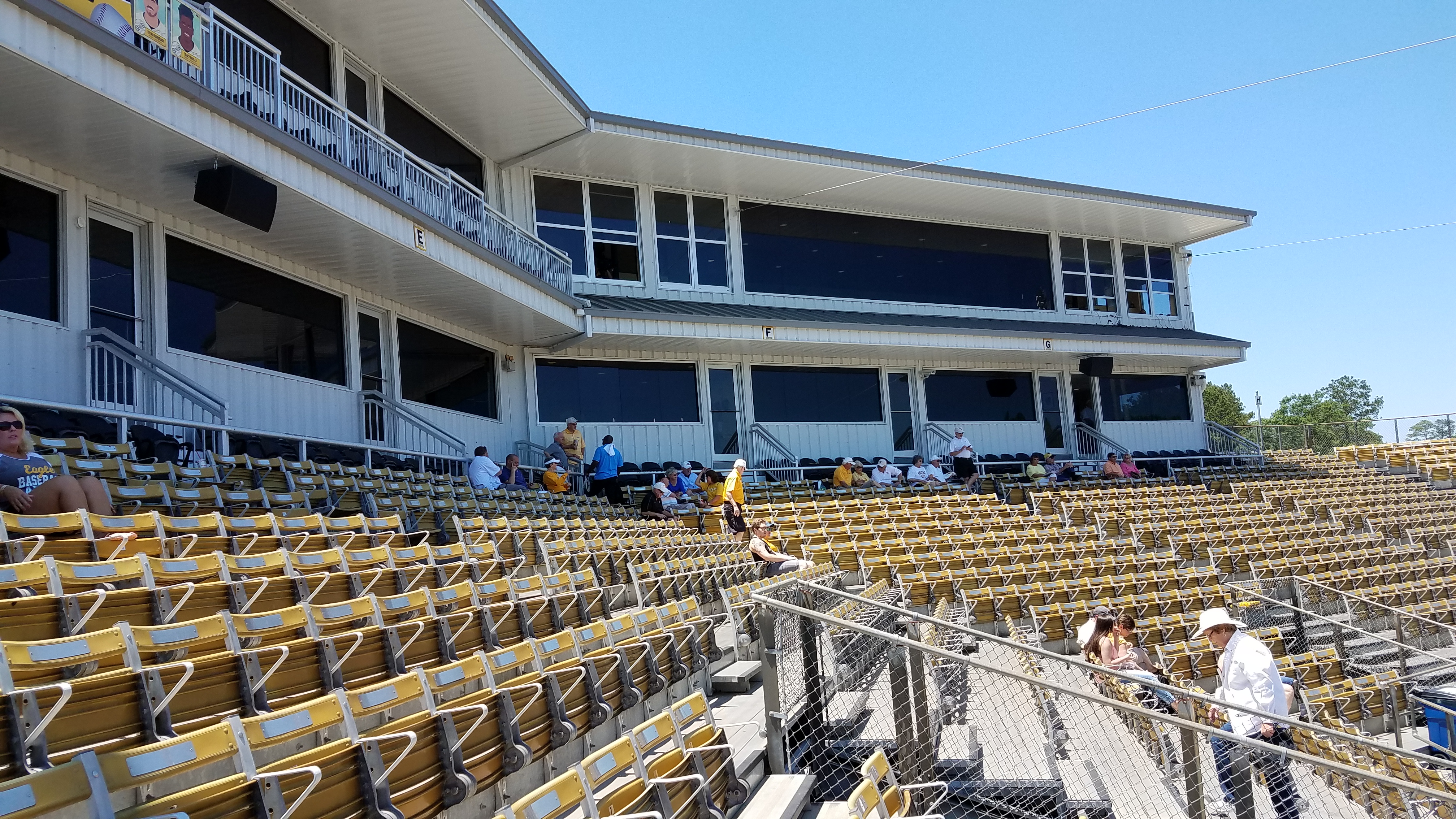 Pete Taylor Park has always had a grandstand, but a 2012 renovation cleaned up the facility, attaching previously separated bleachers at each end that extend just past the dugouts. Also added was a double-deck structure just behind the top row that includes luxury suites and a press box. The main seating bowl is angled outward after the first few home plate sections and the two-thirds of the park with individual seating is in the form of older, fold-down seats in a gold color. Cover from the elements is lacking, but the top couple of rows do receive shade during afternoon games. Wider, black seats are found just below the walkway as a few rows are near the field. A look to the outfield provides fans a pleasant background of trees, which is consistent for wooded Southern Mississippi.