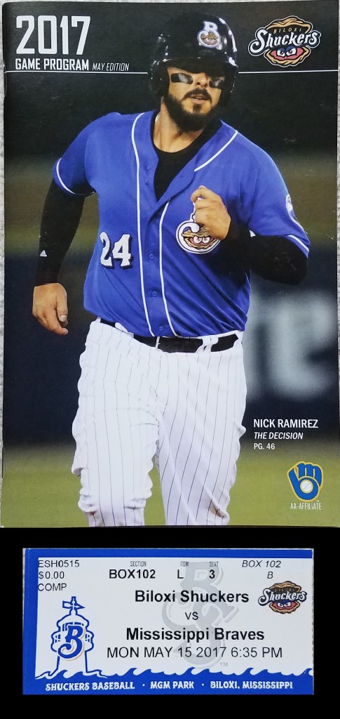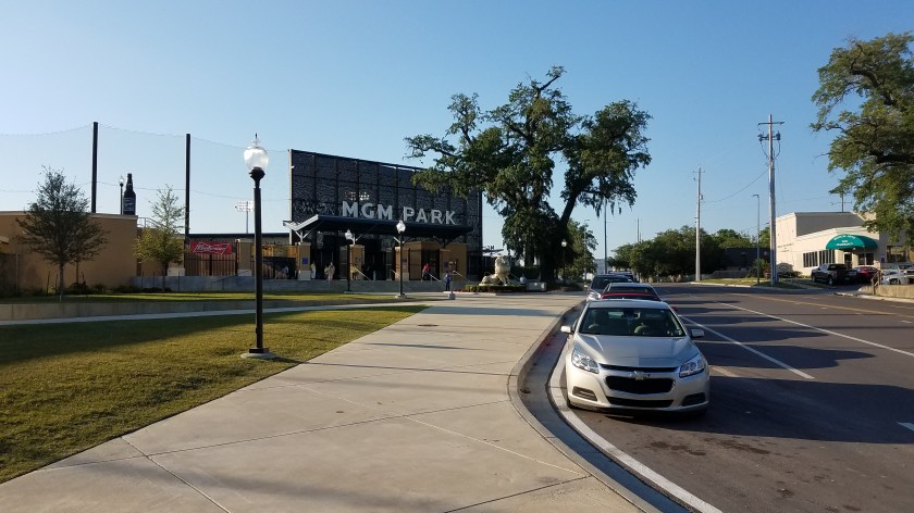 Minor-League baseball has gone super whacky with nicknames, to a point that I don’t like most of them, but Shuckers is one that works well. It is reflective of the area as it relates to the seafood industry and it isn’t ridiculously outrageous (like Jumbo Shrimp or Rumble Ponies). Plus, they have a decent logo……The Shuckers Shop is located behind home plate in the concourse……Not only did this area suffer one disaster in Katrina, but a second one in the BP Oil Spill five years later had a devastating impact as well. Economy, tourism and the environment were dealt quite an awful blow because of this manmade disaster……The Beau Rivage leased the ballpark land for $1 in exchange for an employee parking garage and naming rights. However, with MiLB having an issue with a Casino-named ballpark, the parent company of MGM got the name. The deal may not last long as city disputes with ballpark revenue might lead to a restructured deal.