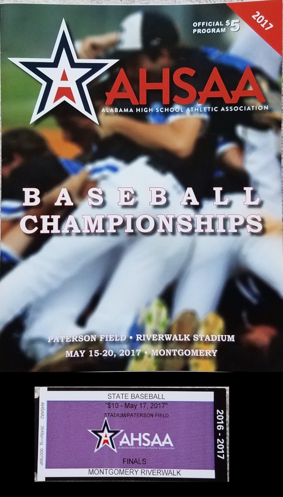 The first two segments of a three-part renovation helped to address several of Paterson’s problems (some of them hazardous) a few years ago. The third phase is the most involved as what is planned would add and enhance a lot of ballpark elements. However, the city has yet to approve this plan with funding still unavailable. Time will tell if this ends up happening……Here’s how the State Tournament works: The regular season 1st and 2nd place teams in 16 “areas” earn entry to the 32-team state tournament. These “areas” are made up of 3-5 teams within the same classification and non-area games are used for tiebreakers. Each matchup is Best-of-3 at a designated home school until the final in Montgomery. That is where seven classifications crown a champion and at least one of the games is at Riverwalk Stadium. If Game 3 is necessary, it is part of a doubleheader…..High School Baseball is a 7-inning affair…..Though schools change classifications, Hartselle has the most 5A championships with eight. G.W. Long (Skipperville) has the most overall state titles……There was a huge sign out front saying no outside food or drinks, however, we had no problem bringing ours in via a backpack…..Minor-league baseball was often played at Paterson Field during its history and the Double-A Rebels were the last team to play, before leaving in 1980. When baseball came back at that level, it would return to a new ballpark downtown (Riverwalk) in 2004. Currently, the city’s 7 high school teams use Paterson as a home field….NCAA’s Division II championship had a multi-decade run here.