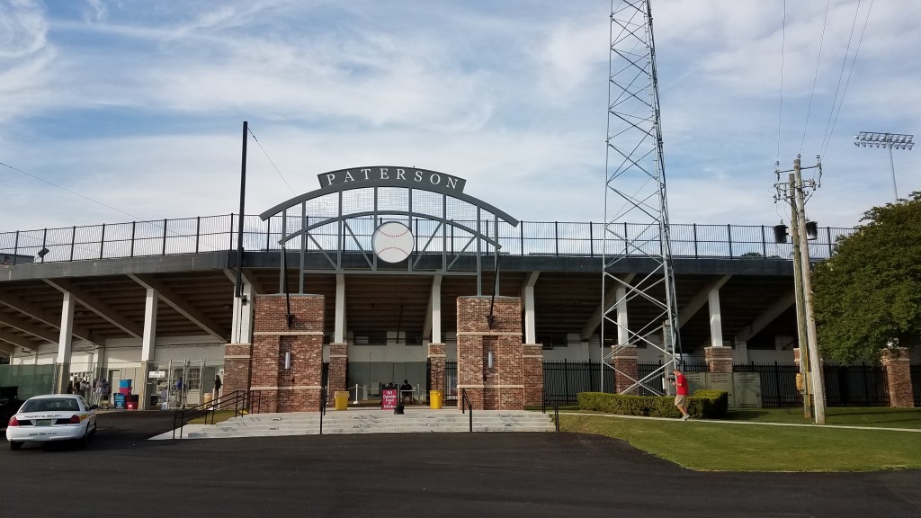 For any ballpark built before 1950, I hope that there are nostaligic elements and Paterson Field just doesn’t have that. A big part of that is the absence of the deteriorating awning that covered most of the sections behind home plate. This was removed a few years ago for safety concerns and has not been replaced. The lack of any roof or overhang along with seating predominately made up of metal bleachers with backs makes for a sterile, boring ballpark. Those bleachers at least are new and did replace splintering wooden ones. Seats extend around the infield and 15-19 rows are divided by a lower walkway with a few rows near field-level. Only the first few rows near the dugout have individual chairs. The press box is cut into the upper seats behind home plate. Adding to the ballpark feel (and not in a good way) is the loud hum of the light poles that make up the “scenery”, in conjunction with transmission towers for a nearby public broadcasting station. At least the outfield backdrop is a tree-covered bluff that includes one house with a great view of the game. I’m always happy to see an extinct pro stadium live to see another day, but there are certainly better ones out there.