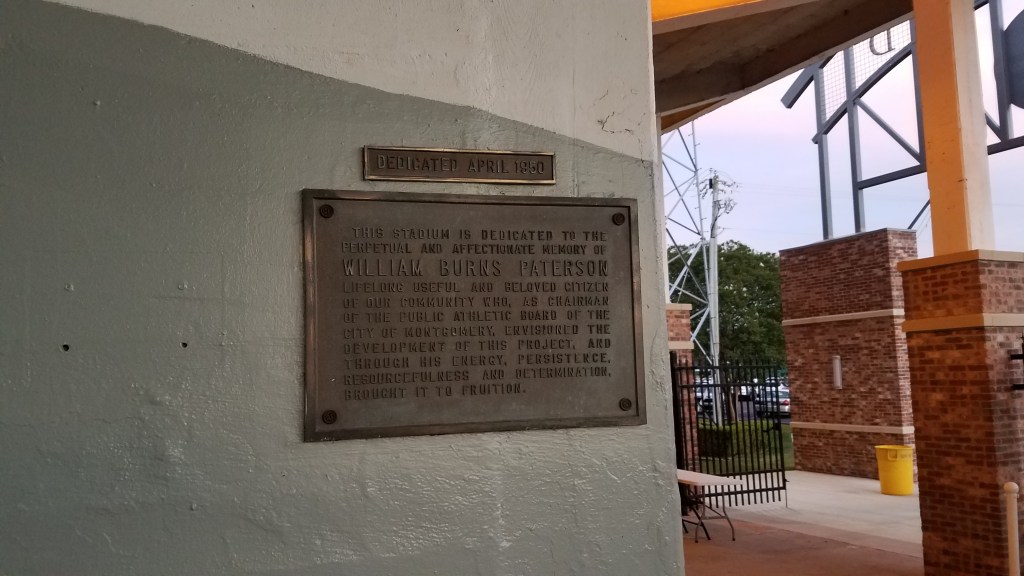 There is a dedication plaque to William Burns Paterson, whom the field is named after, for his efforts to get the stadium built. This small, bronze marker is on the wall of an opening from the concourse. On the outfield wall is an image of the flag for the city of Montgomery.