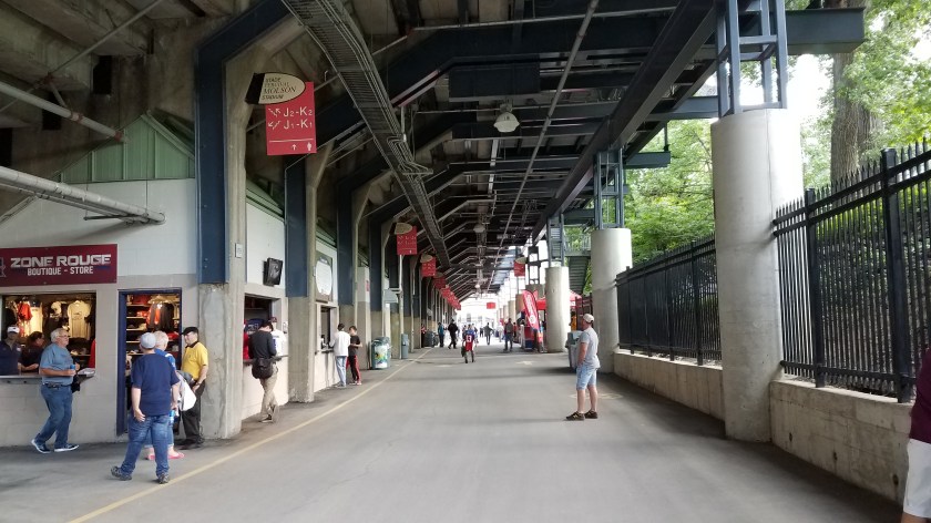 The north sideline concourse is the tightest in terms of space and it is not a fun place to be during typically crowded periods. The area is completely covered and somewhat dark as the mix of concrete and brick walls have a few spots on them with Alouette posters. Multiple spots include stairs for access to the upper deck and the additional space helps alleviate traffic. It’s also both outdoors and covered by a seating overhang. The other sideline has a little bit more area for its concourse, but it serves many more seats. Each end has a detached, outdoor walkway and while the east end has the room it also involves a steep uphill/downhill pitch. The other congested end is the Fan Zone, a party section with several pop-up tents.