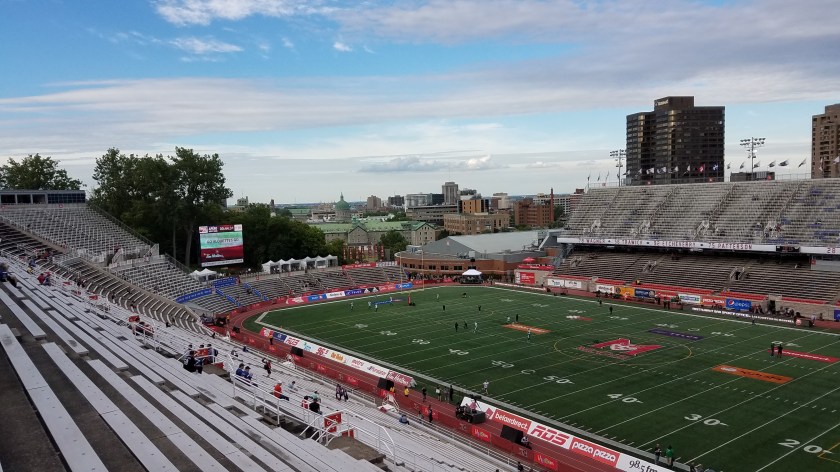 While in town for a three-day work symposium, I had the good luck of having a free evening coincide with a CFL home game. At a population of 1.6 million, Montreal is Canada’s second-largest city and it is truly awesome. There is a great deal of culture and entertainment in this bilingual city, which is in the southwest corner of Quebec, along the St. Lawrence River. The predominant language of French and the cobblestoned section of Old Montreal gives the city a distict European feel. Football has had a presence in Montreal since 1946, when the Alouettes were born, however they were twice disbanded in the 1980s. This current version came about as a relocation from the league’s American experiment as the team moved from Baltimore in 1995. They were quickly successful on the field and the Al’s won three of their seven Grey Cups in the 2000s. A fortunate set of circumstances led to Montreal moving into Percival Molson Memorial Stadium in 1997 and the now 102-year-old stadium makes for a remarkable home that combines a gorgeous setting with a mix of old and new architectural features.