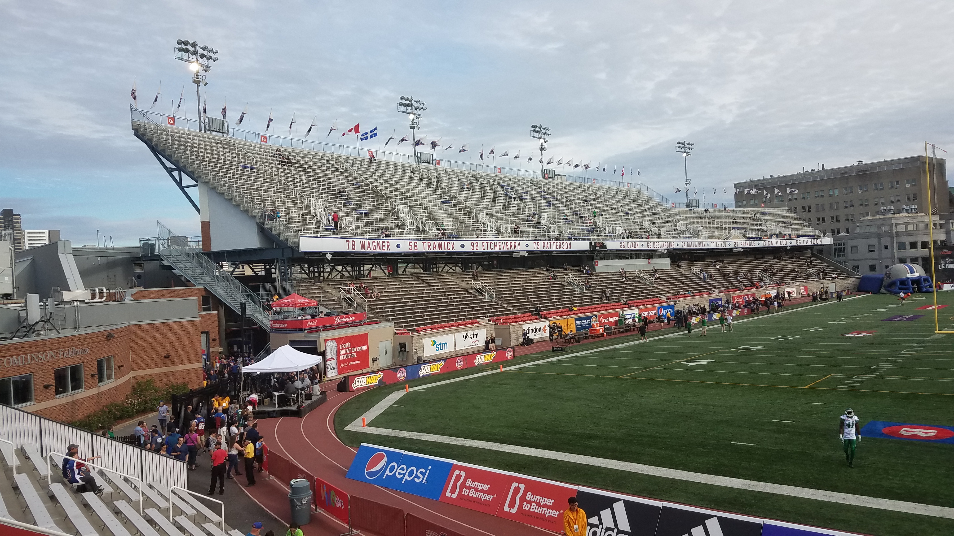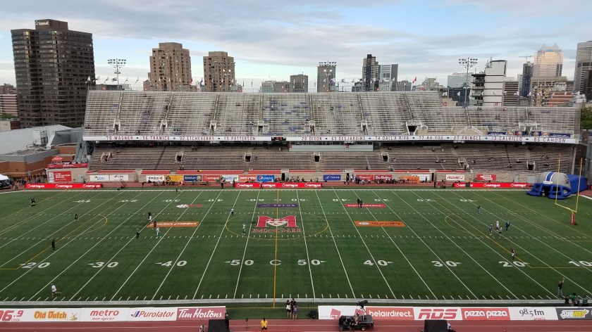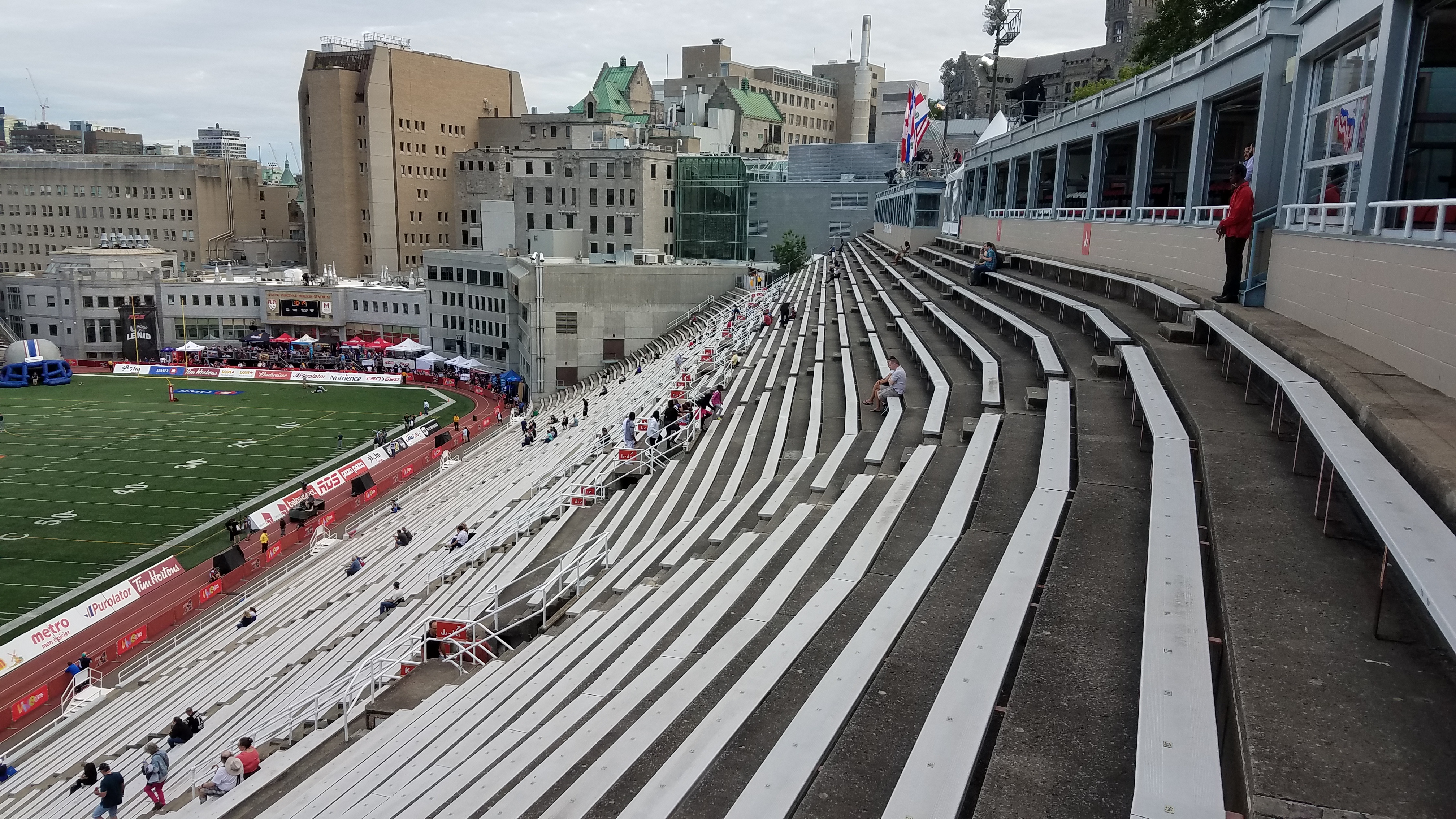 The hillside setting is what defines this stadium and it leads to spectacular sights both inside and out. Most of the seating is confined to the sidelines and the north side is made up of a singular concrete structure with metal bleachers for each row. Certainly not the most comfortable (especially with most stadiums in the league now made up of chairbacks), as the set-up is typical of with long rows and sections. The hike to the top is aided by concourse openings in the middle of each section and it is certainly worth climbing up as the reward is a view that includes the Montreal skyline and the Plateau neighborhood. At the top of these north-side seats is the press-box and a set of 19 luxury suites that were added as part of a renovation in 2010. That renovation also led to the addition of seats with the partial connection of two more sections, which wrap into a small set of end-zone bleachers topped by corporate hospitality tents. The corner is left open due to the presence of Tomlinson Fieldhouse, then south stands are equally steep with great sightlines despite that it does not have a hillside as a natural development feature. The double-decker arrangement includes a new-ish upper level section that has handrails in front of each row. Look to the left and the busy end zone includes the aforementioned party-deck, hospital and campus buildings, while looming deeper in the foreground is Mount Royal. There is a track around the field, but it does little to affect how far away seats are in this old-school, unique stadium that I loved.