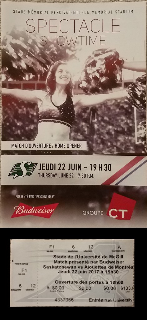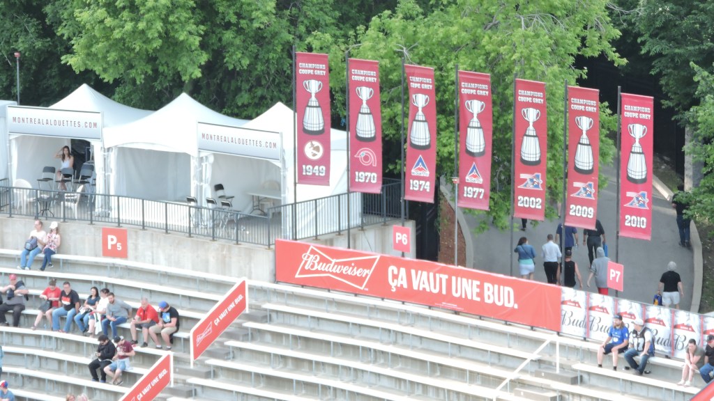 CFL rules are a bit different than American Football as the Canadian version features a larger field, only three downs, 12 players to each side and 1 point (Rogue) if a ball is kicked through the end zone or not returned out of it……An Alouette is not a lark, but actually a French-Canadian song about plucking the feathers of a lark…. When Montreal got football back in the 1990s, they returned to Olympic Stadium. Attendance struggled and it was U2 that got credited with inadvertently saving the team. A concert by the Irish rock band was scheduled for the Big O and that moved the Als to McGill and Molson Stadium for their playoff game. It was a packed house with a great atmosphere and the team won, prompting a permanent move the next season. A U2 song can now be heard before kickoff of each game.