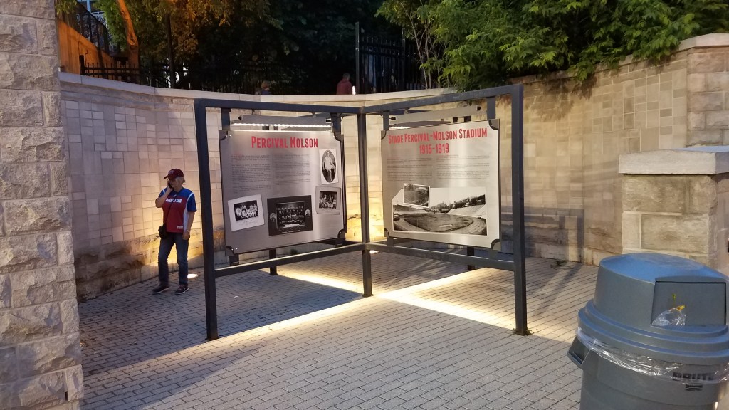 Historical elements of the building make it difficult to splash blue and red paint or Alouette logos everywhere, however the team does have a couple of great sections for this category. Near the main entrance in the corner, a semicircle outlined in stone displays eight panels that give a timeline on the stadium. One of those sections is on Percival Molson, a successful and generous Canadian athlete who died in World War I. His will included funds to complete the stadium and McGill re-named it after him. A bit further in from this area is a stone wall that honors season-ticket holders and marks a couple important moments. Alouette displays are found inside the field area, where the façade on one side of seating features each retired number and name by the team. Two of those players: Anthony Calvillo and Ben Cahoon are all-time leaders in several passing and receiving categories, respectively. Grey Cup Banners stand above the west end seats.