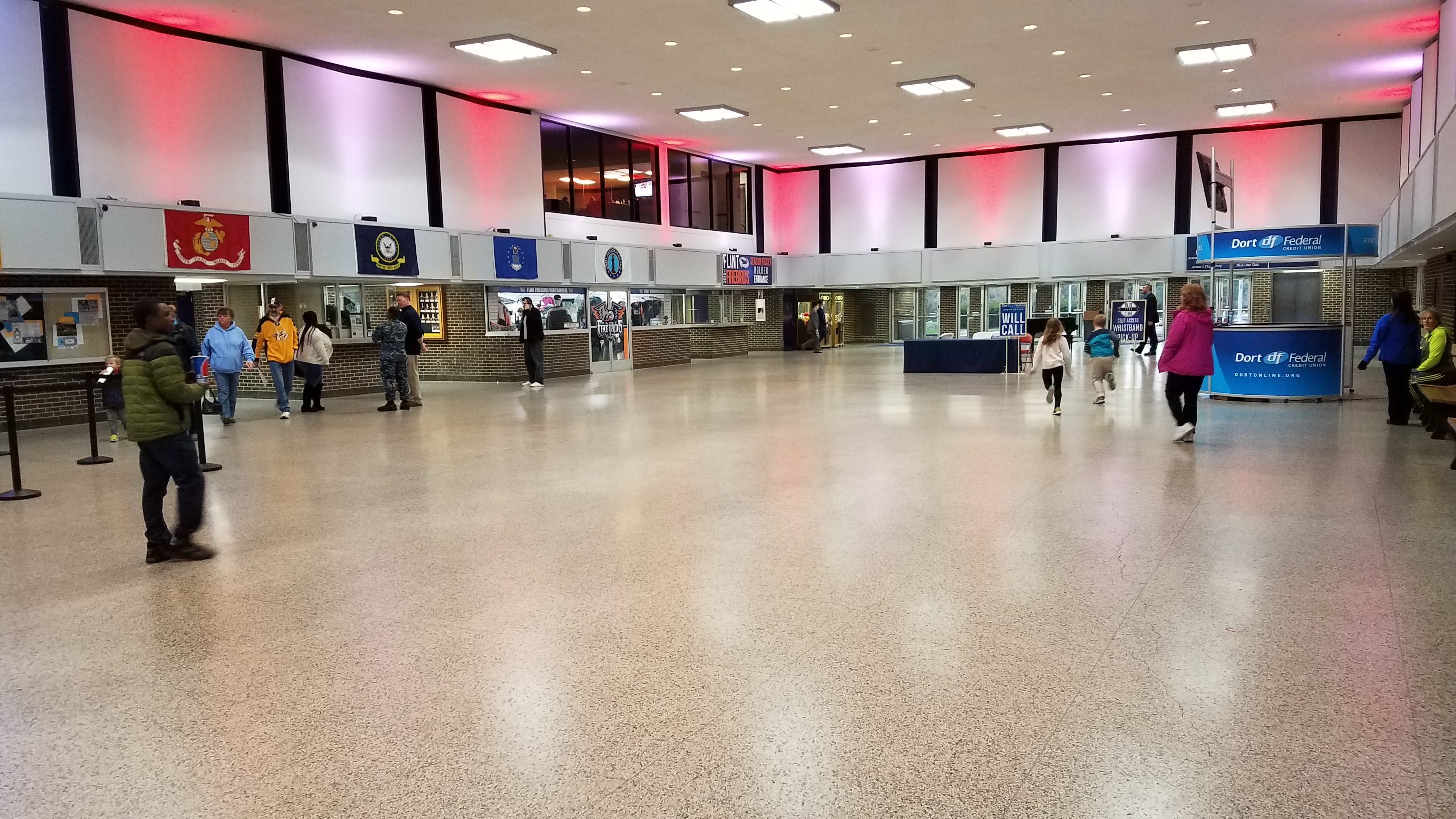 Flint organized many Veteran’s Day honors for those who have served and it was a well done, classy afternoon that gave everybody a chance to say thanks. As for team displays, only an old wooden case in the main atrium does anything to honor the history of hockey in the city. The old Generals memorbelia was nice, but I wanted more. Also leaving me to want more were those plain, white walls along the entire length of the interior walkways.