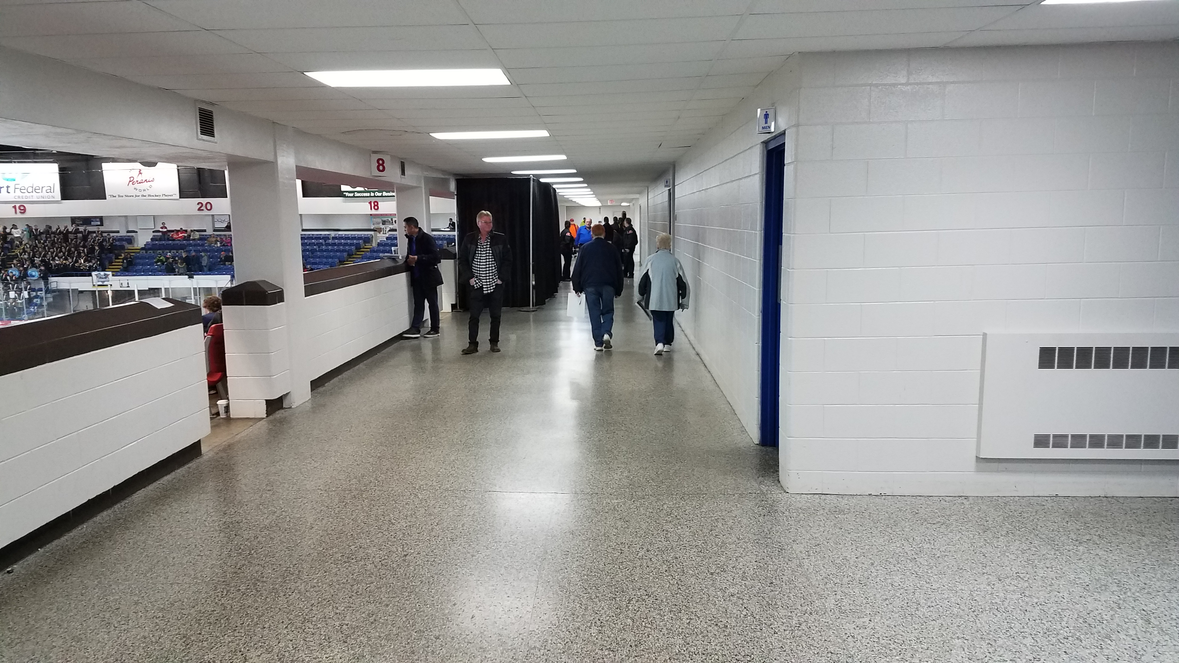 The middle atrium made me think of an entry to a high school auditorium with its older floor design, brick walls and general ceiling tile. What was a nice touch was the soft red and purple lighting on the white panels further up on the wall. Though why not blue and orange for the Firebirds? The space was really wide and accommodating for patrons before they pass through the doors and head inside. I loved how inside the arena, the ring concourse was ballpark-style as fans could see the action while roaming. Great space, but it did lack character as it is nothing but white wall.