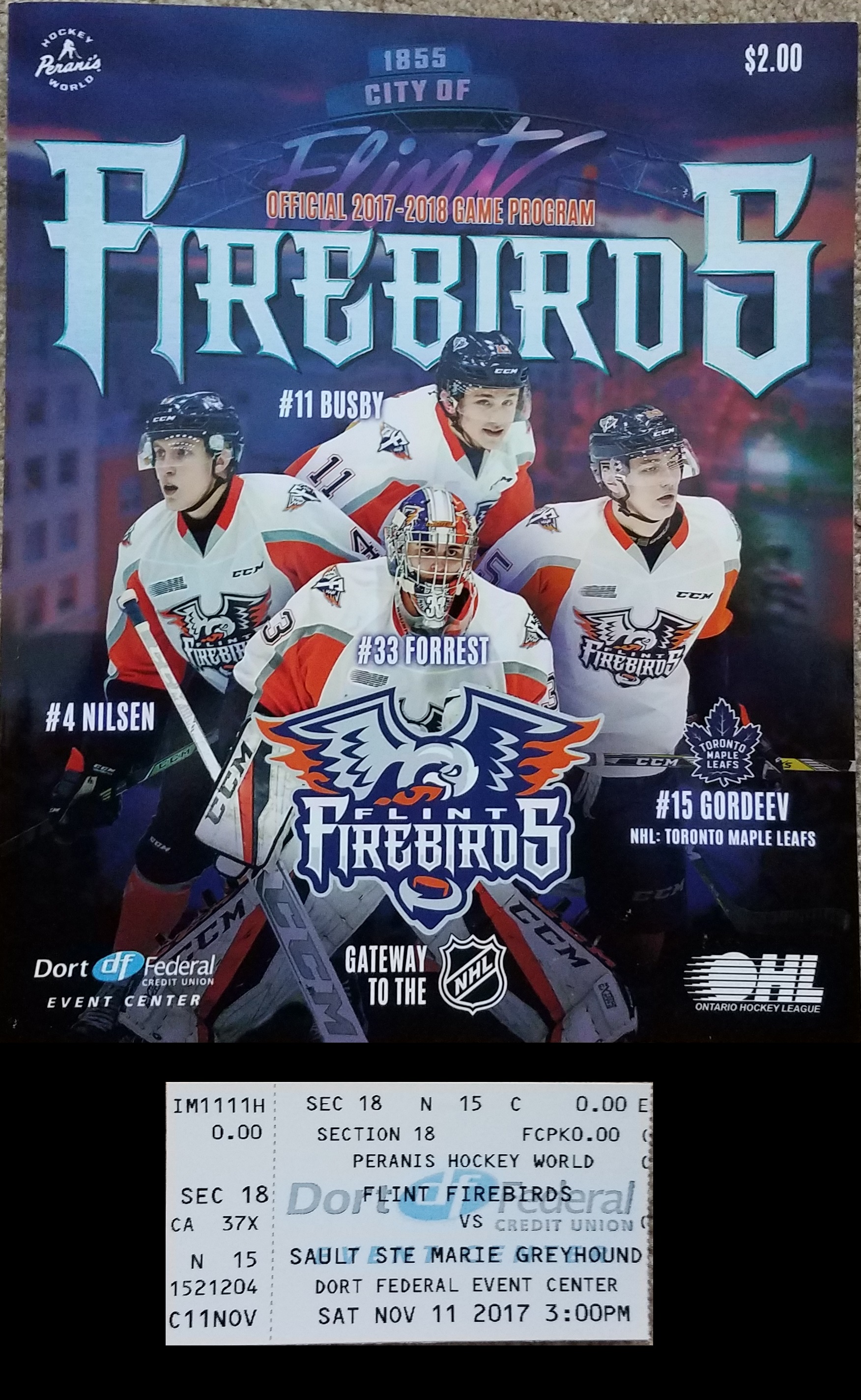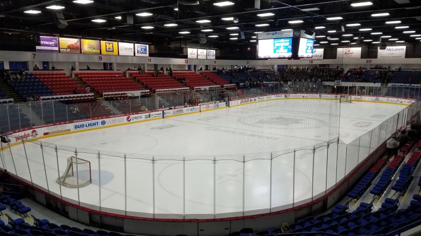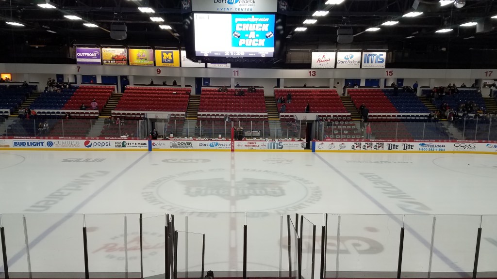 Game 2 on this four stadium trip brought me to Mid-Michigan and the embattled city of Flint. People may think they know Flint’s story, but the media portrayal is far different than reality as this is not as simple as “once flourishing city fallen on hard times”. After starting briefly as a lumber town, Flint became a center for the automotive manufacturing industry, led by GM. When the plant downsized, struggles began as people left and the city experienced an increase in crime and the place went into a major economic depression. Other problems resulted due to horrible leadership, which was the primary reason for the recent water crisis. Despite the sour tone, there have been signs of promise and downtown has seen some development. It’s important to know that this entire city of nearly 100,000 is not rundown and there are many decent places and neighborhoods with a good majority of people who want to live here and they take part in events and other community involvement. Flint is a good place for visitors and for many who call it home. As for the hockey team, the Firebirds moved into town from nearby Plymouth in 2015 and this is their third season, in spite of dealing with the trials and tribulations of the team’s crazy owner, Rolf Nilsen. Games are played in the Dort Federal Event Center, a building that debuted in 1969, but is a viable arena today.