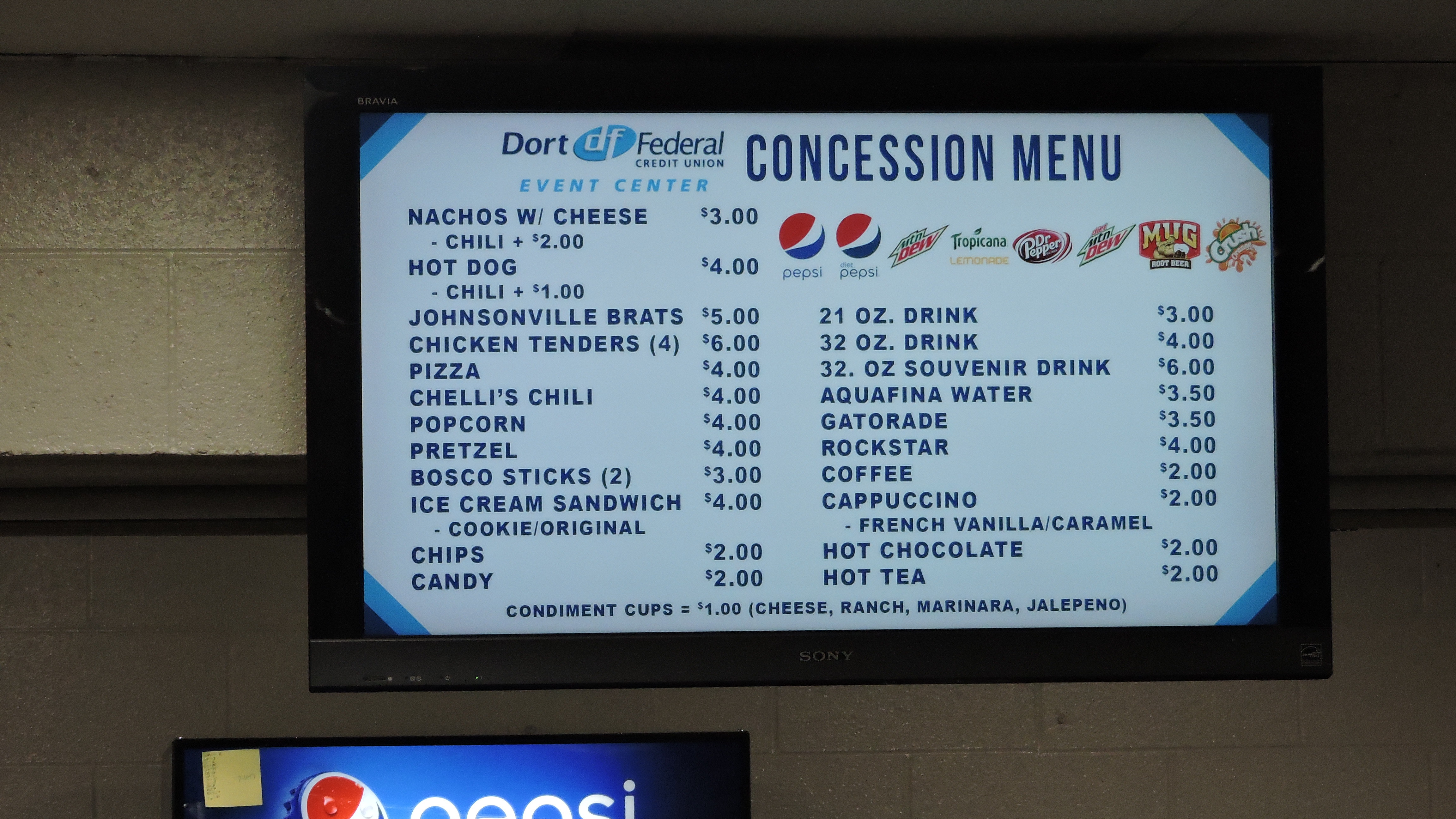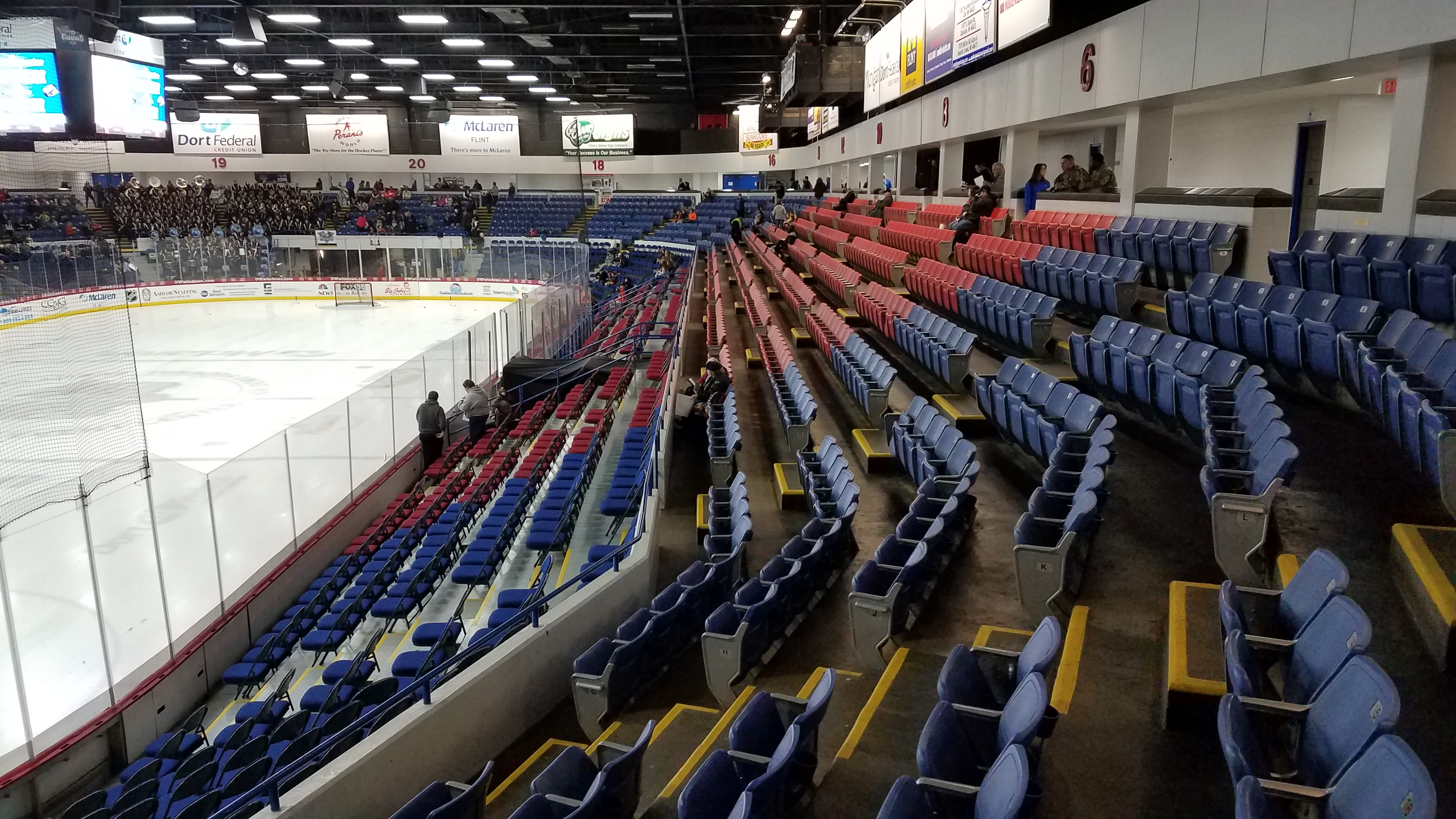Flint’s arena has a straight-forward design that follows the shape of the rink. It isn’t a true oval as the corners are angled, making it more of an octagon. While most of the red and blue seats are set in a concrete base, about two-thirds of the way down is a dividing wall that separates a portable section where the seats are padded folding chairs. The only premium seating is the “Blue Line Club”, a nice area just tucked underneath the low ceiling behind one of the goals. Other random notes: Section numbers are displayed with a big, red number on the white wall behind and above each section. The painting on the ice is quite worn out as it was difficult to make out the Firebird logo in the center circle.