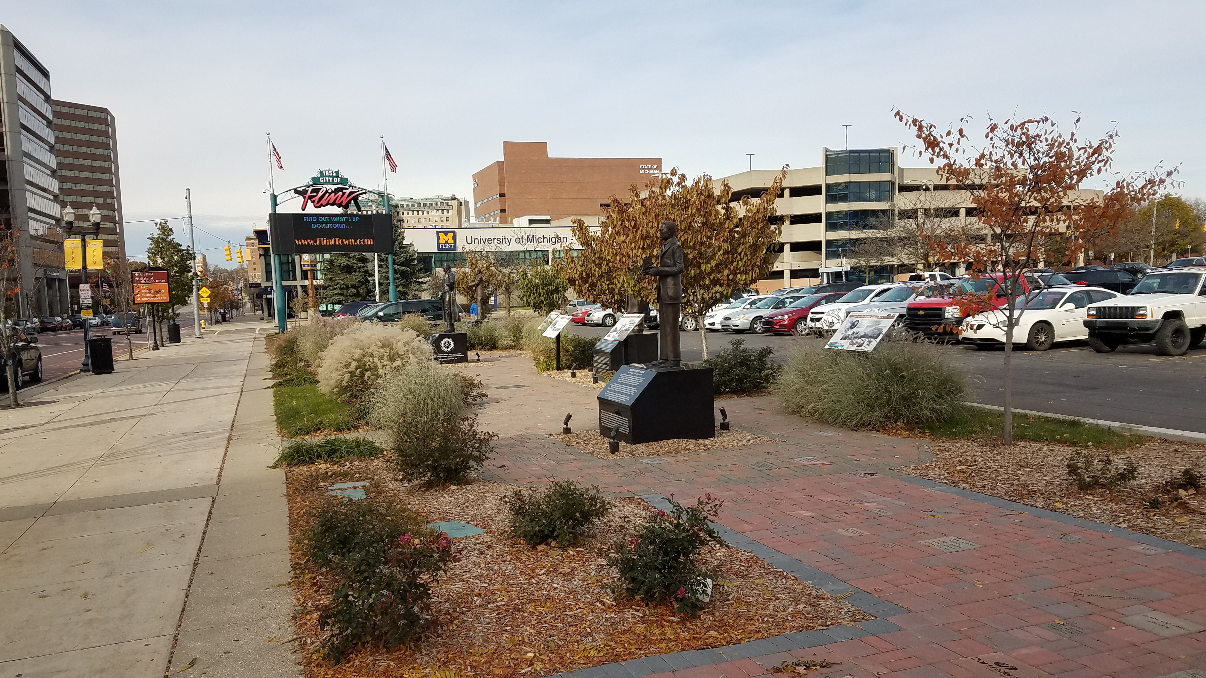 I really enjoyed my six hours in Flint before the game and I encourage those in the area to spend a weekend afternoon in town. The Cultural Center just east of downtown is a real highlight and I found the informative Sloan Museum to be an excellent introduction. I then visited the popular and successful Farmers Market (which operates year-round) and enjoyed a nice lunch and followed that with a walk down Saginaw Street where I saw the famous “Vehicle City” sign. Most of your pre-game time should be spent in those downtown areas as the arena is in a section that does not have much for visitors: just a shopping center and a few other businesses, while across the street is a neighborhood and church.