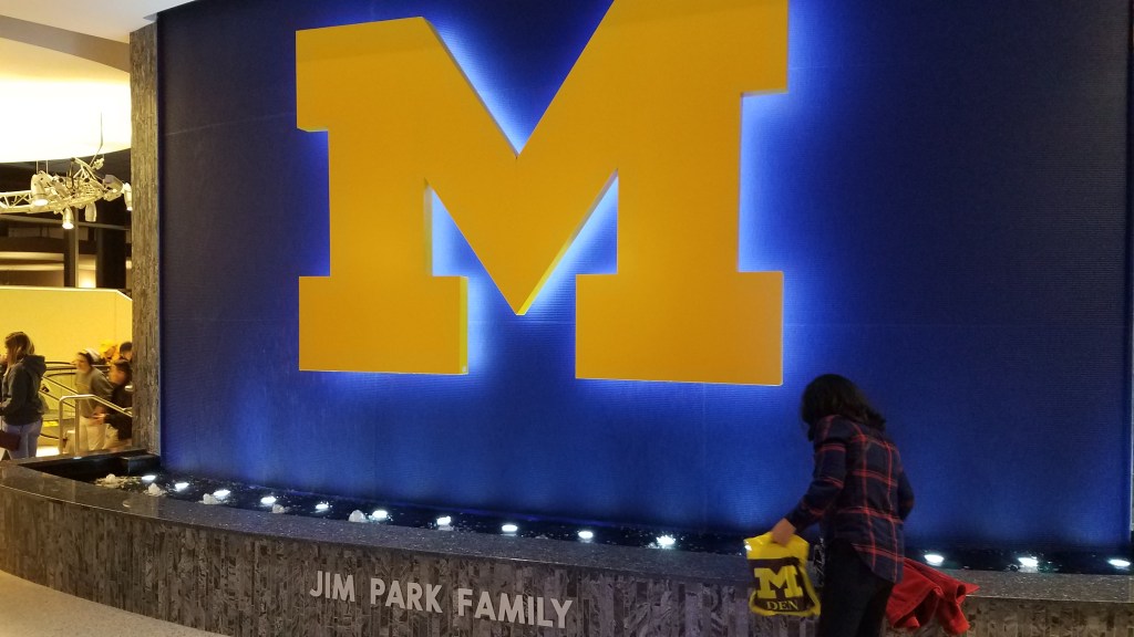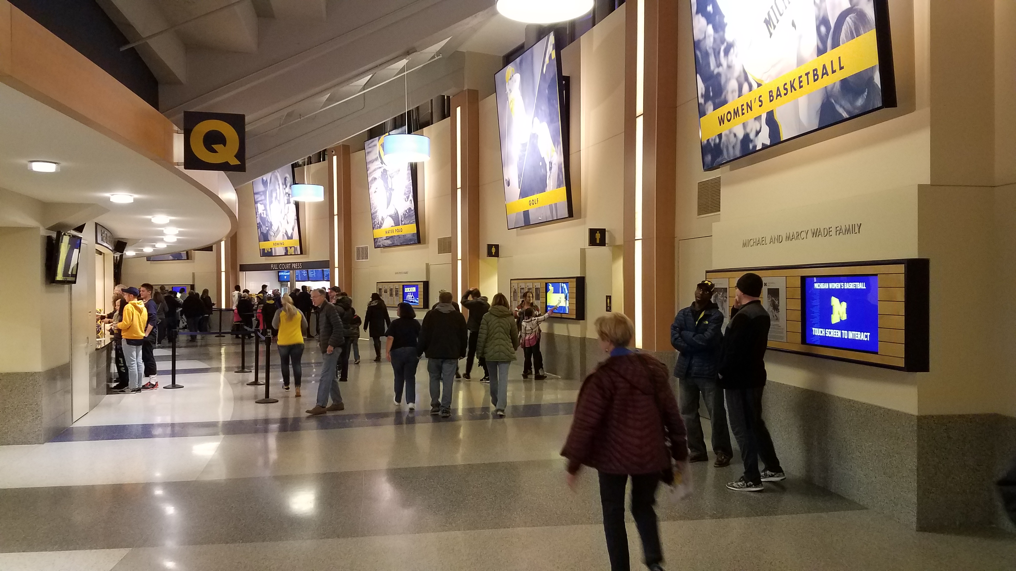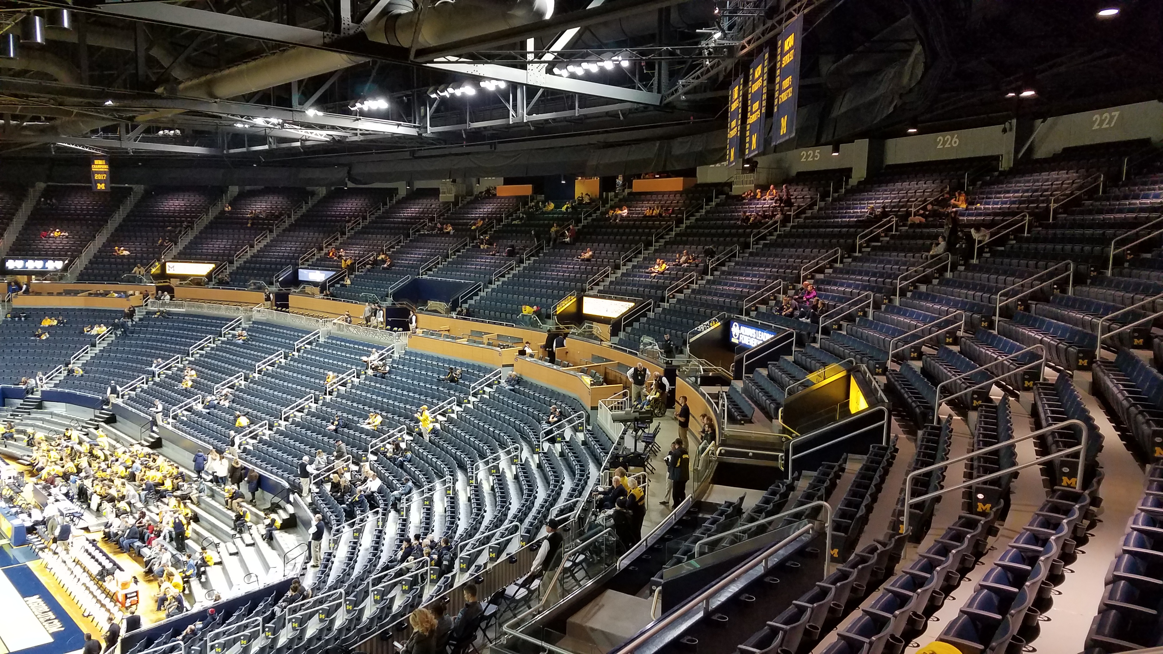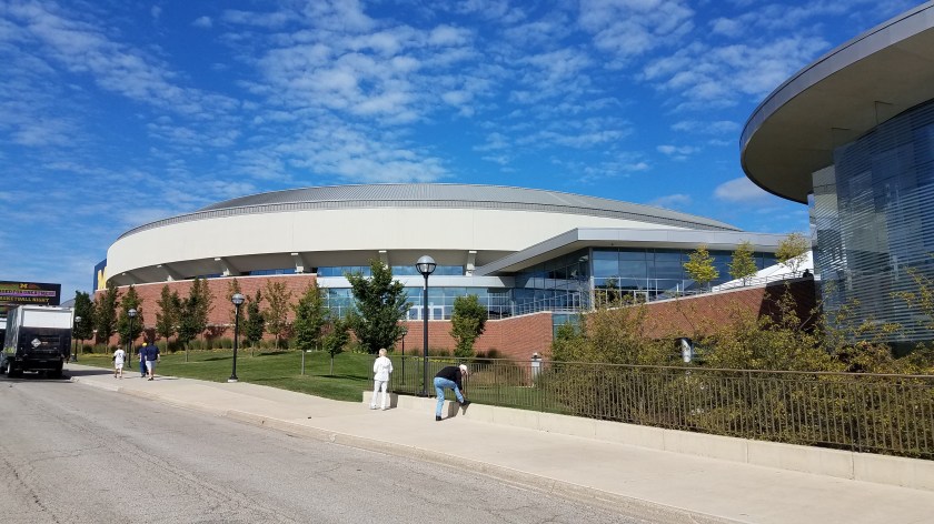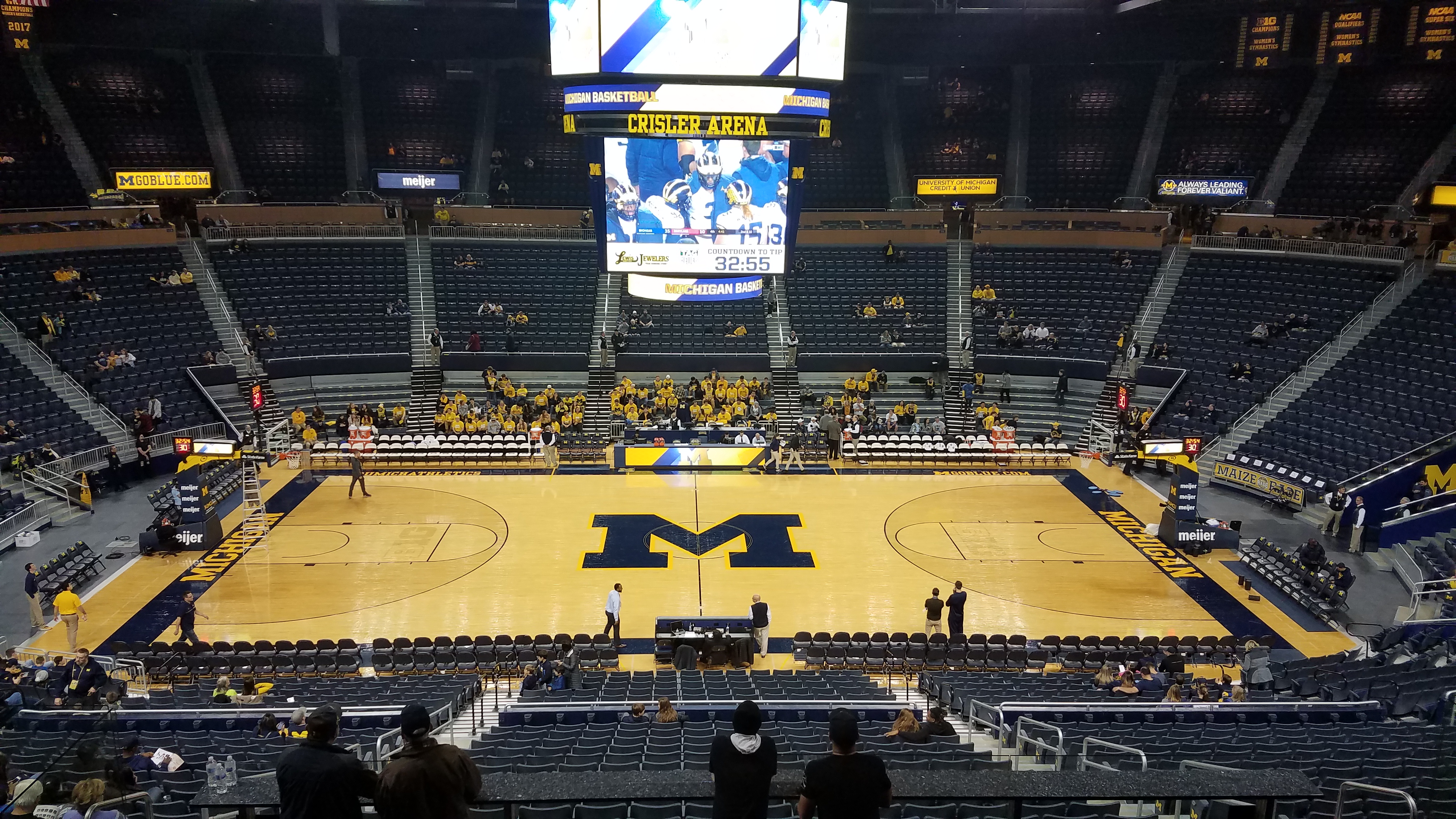 Google Maps saved the day as the app diverted me around 30 minutes of traffic to get me to the Crisler Center in time after leaving a game from Flint. Located in Southeast Michigan about 45 minutes from Detroit, the city of Ann Arbor is surprisingly the 6th largest in the state (population around 115,000) as it has the feel of a large college town. The University of Michigan certainly is a significant component to A2 as much of the city’s economy is centered on it and the school’s resources help to bring many other types of companies and services. Michigan is one of the leading research universities in the country and it is a Top 40 school, also classified as a Public Ivy. It is a big one too with 13 different departments (colleges/schools) and over 43,000 students. The Wolverines basketball team is a successful program with 14 Big Ten titles and 27 NCAA Tournament appearances. Seven of those remarkably ended in the Final Four. Michigan did win the 1989 Championship and a couple years later, they made it to the title game in back-to-back appearances with the Fab Five. However, those records were vacated due to the Ed Martin significant money loaning scandal. After subsequent teams struggled because of the sanctions, Michigan basketball finally recovered in 2009 as they made a trip back to the Big Dance after a long absence. Under the respected John Beilien, the Wolverines have made it 7 out of the last 8 years, including a trip to the championship game in 2013. Games are played in the Crisler Center. Built in 1967, but significantly renovated in 2012, Crisler is a sparklingly clean arena with a great concourse.