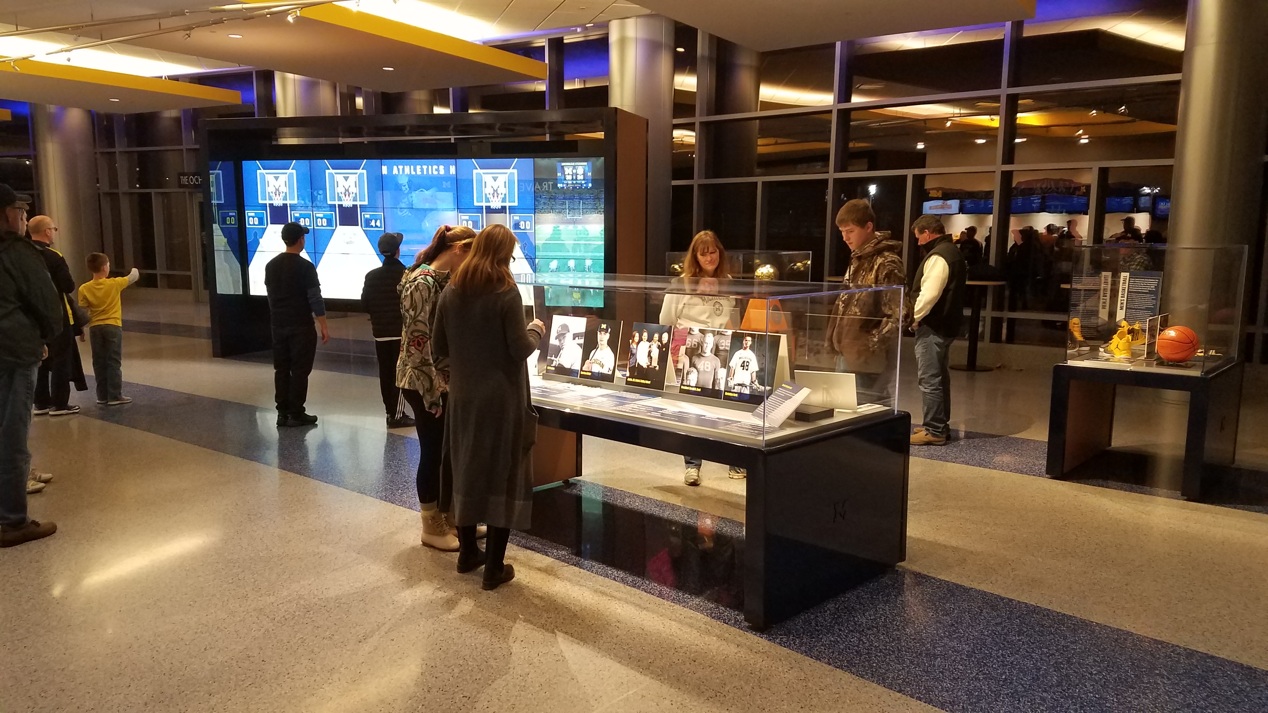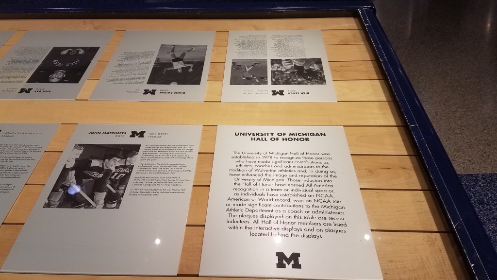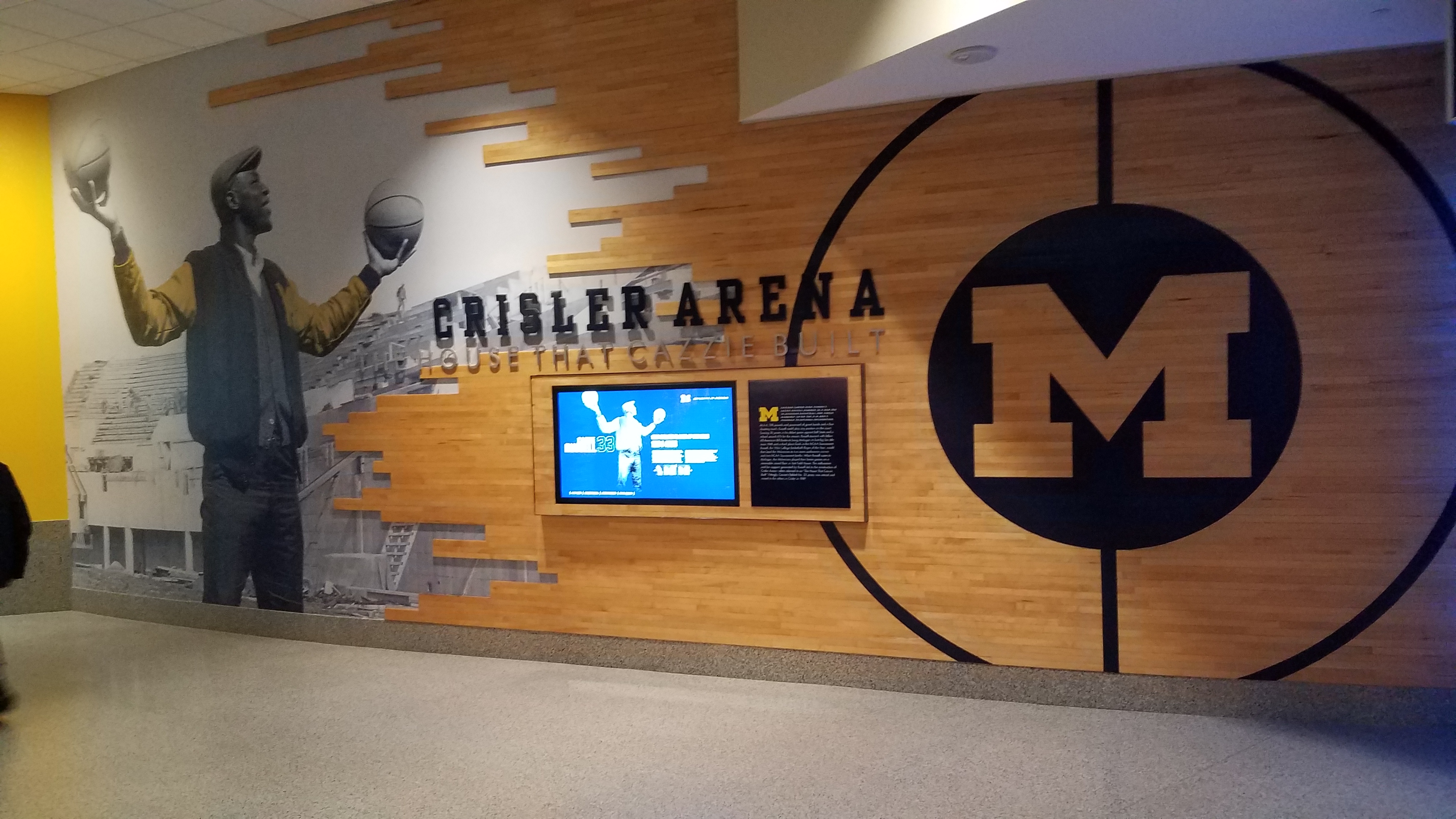 After the aforementioned waterfall and Cazzie display, the adjacent area is worth spending some time in as fans will find plenty of well-done, interactive displays. Not just for basketball, but all of Michigan athletics get honored and admired in this area. Also included is an individual Hall of Honor. The rest of the concourse has a wall dedicated to each sport and next to plaques for the best athletes, visitors can navigate a touch screen to learn all about the history and current information on that sport at Michigan. This is the first of its kind that I have seen and it is great. Also, bonus point for the Big Ten Championship trophy display in an area that is perfect for a picture. Inside the arena, Michigan is above having minor achievement banners as only Big Ten championships, NCAA Final Fours and NCAA/NIT Championships are honored. There are also five retired numbers hanging from the rafters. Notable is the missing Fab Five years as those vacated seasons mean banners come down.