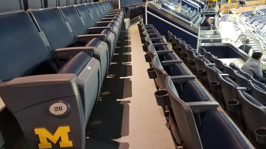The inside of the arena maintains a clean look and the design is simple with a slightly elongated O shape. A middle walkway separates the single-tier 100 and 200 sections, while portions of the walkway are quartered off for the creation of Champions Boxes. This seems nice because it means no deck of suites and a potentially closer bowl to the court. However, the lack of an upper-deck here made the higher rows in the 200 sections feel a good bit away from the court (plus, the last few rows became obstructed by the ceiling). Dark blue seats were wide and very comfortable. I always found Crisler to be on the darker side from a television perspective and that is indeed true, but mainly just in the upper section. Still, it was not too bad. Behind the benches is a partitioned, bucket bleacher section where the student “Maize Rage” do their thang during the game.