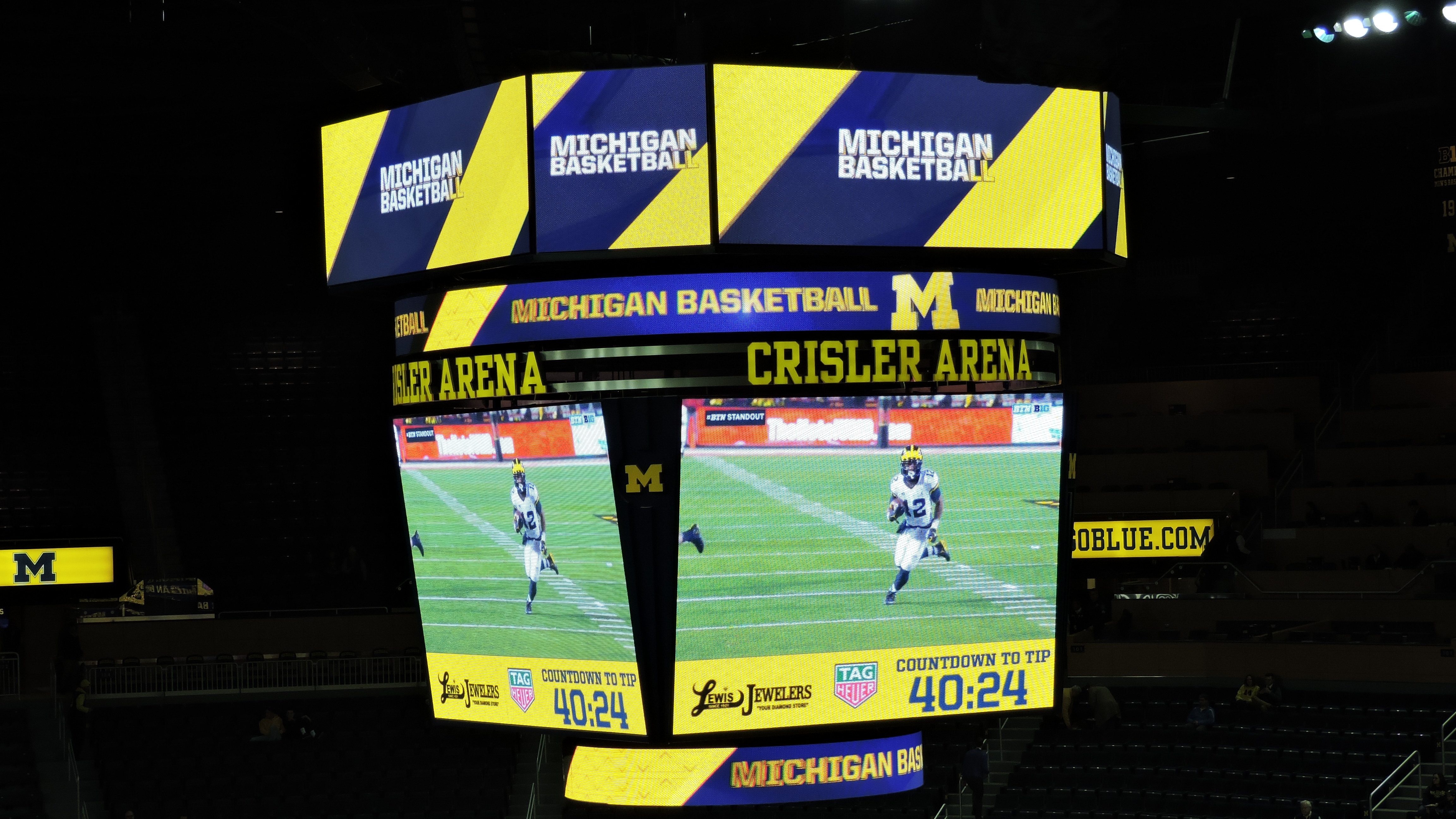 The scoreboard is highlighted by four video screens that are as clear as one would expect here. A circular design is above and below, with a brightly maize-colored Crisler Center sign. More video screens are located at the top of the scoreboard and during the game, these display live player stats. Additional screens in this area allow for the display of a few advertisements. I’ve never been a huge fan of the stacked scoreboards, but it does work well here.