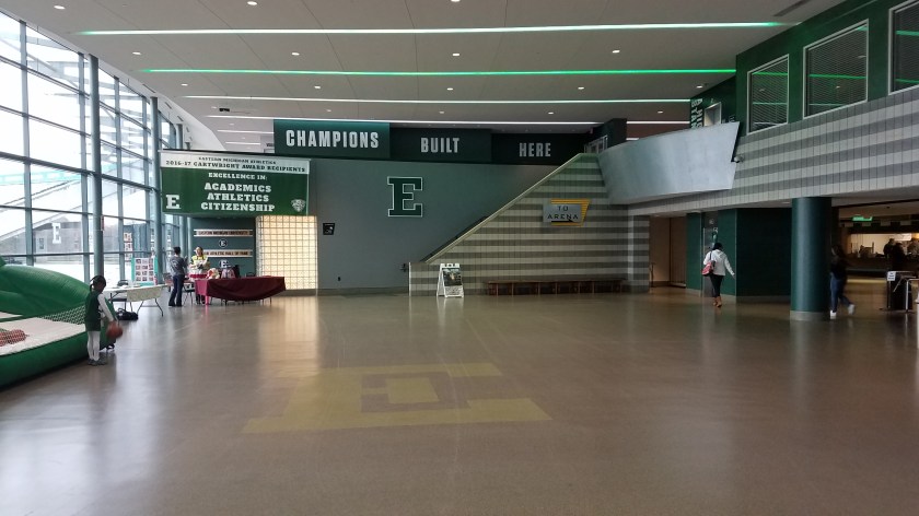Walking in is a much different story as visitors are greeted by a beautiful atrium that is accented in green and decked out with Block E logos. On the left, are floor to ceiling windows that offer a splendid panoramic of Rynearson Stadium. Even with a little fun zone on the side for kids, there is a vast amount of space in this area. Just past the ticket office is the entrance inside, which leads to a traditional concourse in the shape of a square. Walkways are tighter, but that is not a problem with EMU BB crowd size. Walls are tiled, while the rest of the concourse has exposed concrete and there are even some spots where giant air ducts are visible.