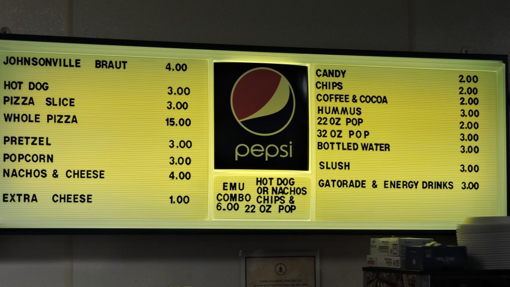 Space is available for several food stands, however only one was open for this game. Using an open-face letter board, limited choices included sausage, hot dogs, pizza, pretzels, popcorn and nachos. My Western New York roots were happy to see soda labelled as “Pop”.