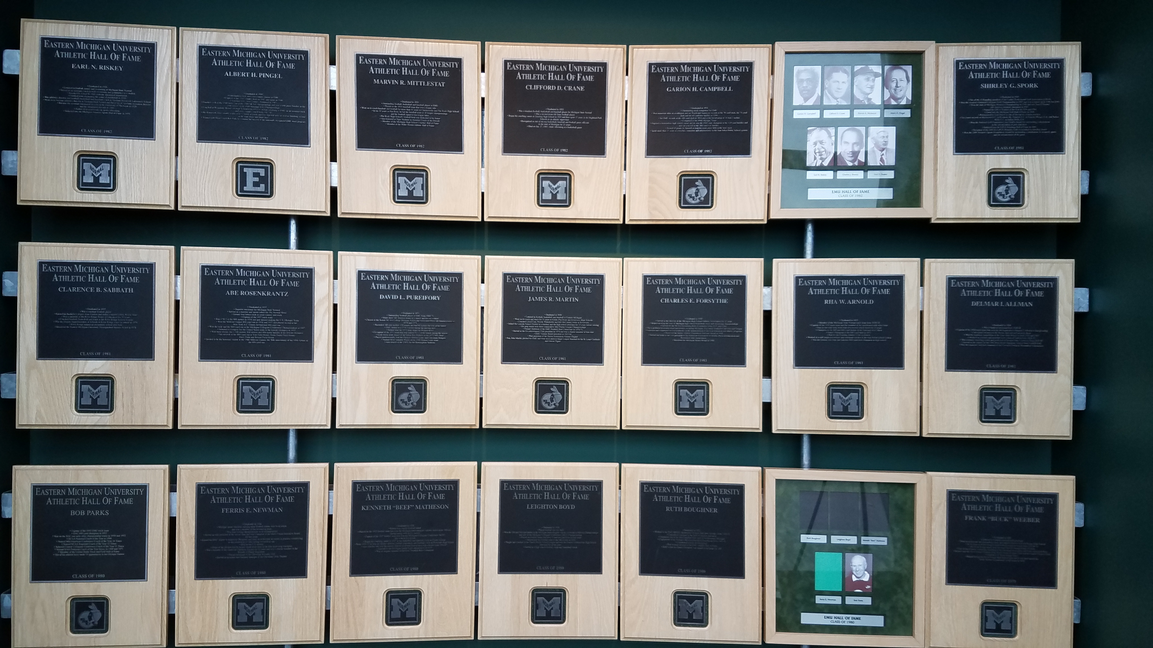 Located at the end of the opening atrium by the wall of windows is the E-club Athletic Hall of Fame. There are lots of athlete plaques to peruse in this HOF and the school even started running out of room as the 2017 class was buried in a corner near a closet door. Otherwise, this is a fine section to honor the best Eagles. Deeper inside the concourse, there is little else to see, save for the fight song mural on one of the walls. Banners hang down from the rafters in the arena and they are a hodgepodge of designs that depended on when they were first created. Conference, NCAA and NIT honors are recognized. At the other end, are the jerseys of four EMU Men’s Basketball players and one Women’s.