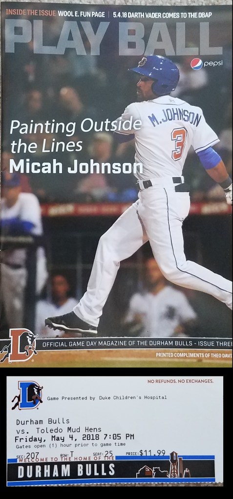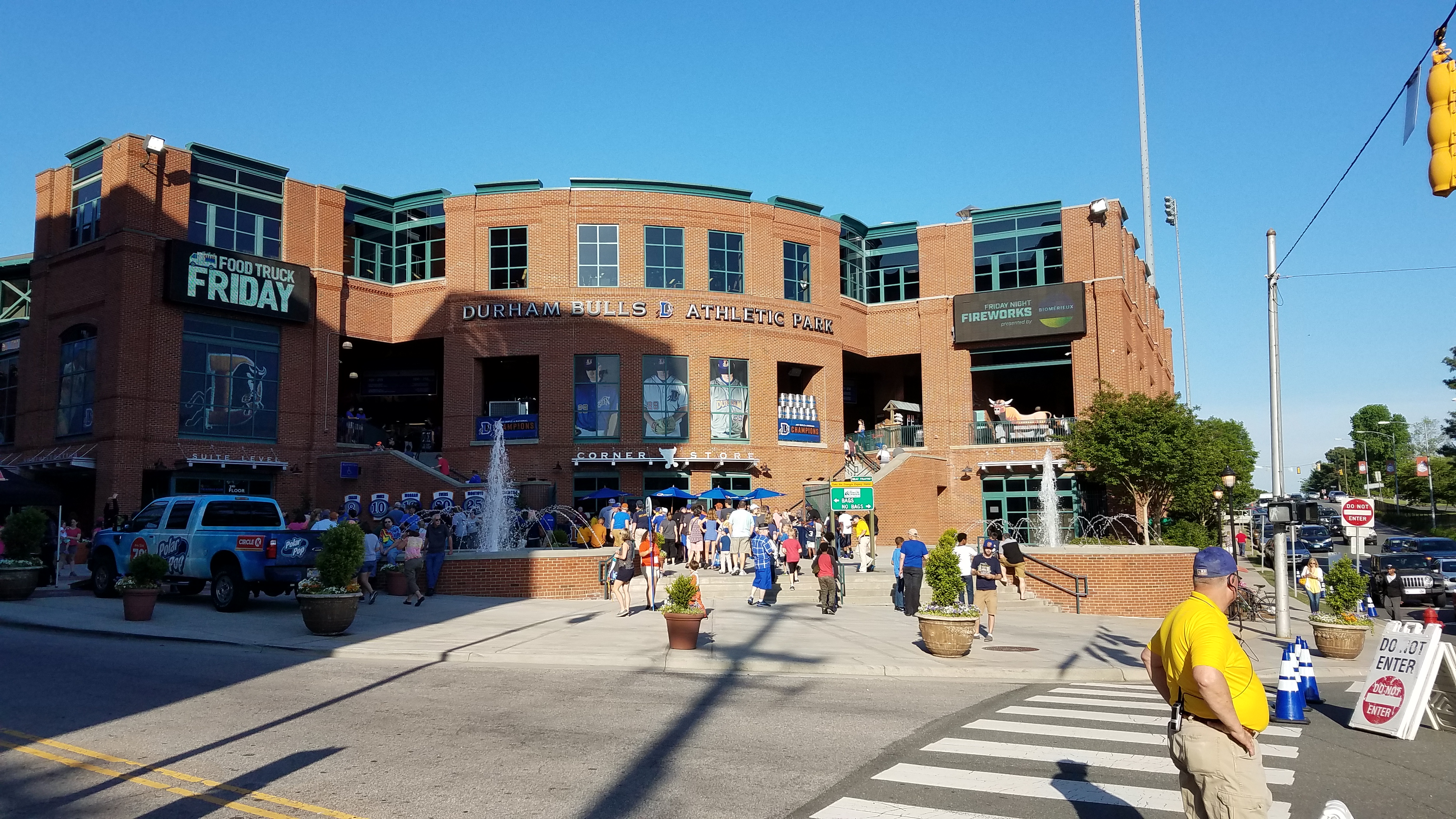 Durham Athletic Park still stands and fans of the movie can go check it out as it is just south of downtown. Built in 1940, the DAP looks great and still has that iconic, circular ticket tower in front. North Carolina Central University plays here and I went to check out a game the next day, which was a memorable experience……The Bulls have been affiliated with Tampa Bay ever since they moved to the IL……The “Bull” origin likely comes from the Bull Durham Tobacco Company……I collect ticket stubs and occasionally my entry in is not in traditional stub form. I hopelessly ask “Fan Assistance” for an unused stub and often am met with a bewildered look. For the first time in my travels, I had success in Durham. Thank you to the attendant for not only accommodating the request but being kind and gracious in the process….The field is named after Jim Goodmon, President of the company that owns the team and facilitator for the ballpark and surrounding development.