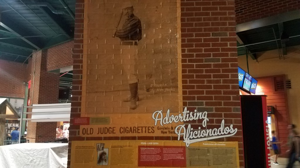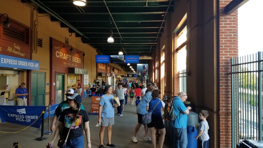 Part of the concourse is enclosed underneath the seating bowl and I’m fine with that since it goes 360 degrees around the park, with the other half of it open-air. Framed by brick on one side and a wonderful tan and brown colored wall on the other, the interior space is plentiful and enjoyable to walk around as wall displays are abundant and concession signs eye-appealing. There is even a “beer garden” space to those that want to eat or drink down here. DBAP has plenty of stairs and another set needs to be climbed to reach the second part of the concourse, which runs atop the seating bowl and around the outfield. This winding walkway has it all: a large bar with plenty of seating, Wool E. World’s playground and Lowes Landing. Yes, baseball may seem a distraction here, but the landing has shuffleboard, a putting green, a giant Connect Four game and cornhole. The outfield has a city-feel to it with the buildings on the other side and railings along the undulating fence to watch.