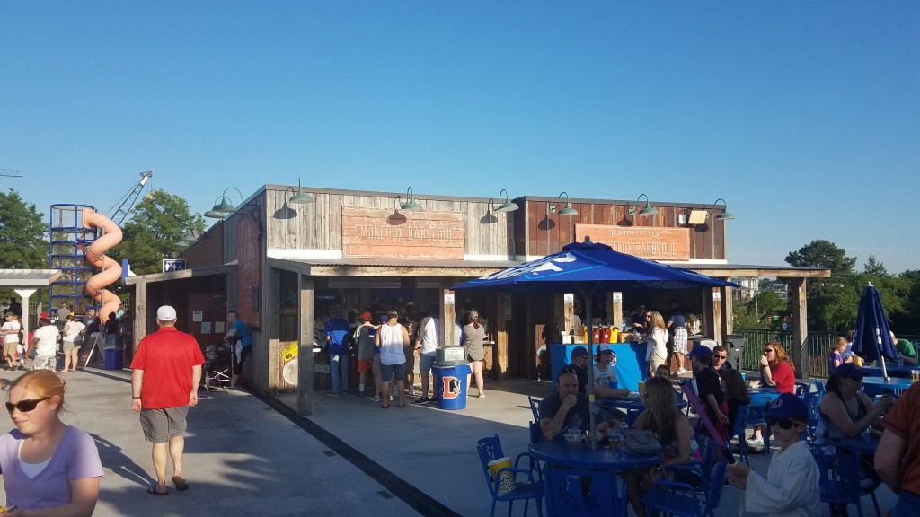 They have their own brewery! Bull Durham Beer Company can be seen from the inner concourse and of course their varieties of brew are available. Durham certainly is part of the craft beer explosion and I counted at least six different microbreweries available. For the food, most of the ballpark standards had offshoots (ex. 4 different kinds of hot dogs, 3 different burgers). I was relieved to see an Eastern-NC style BBQ stand, which featured traditional platters highlighted by the pulled pork. Other standouts include: Makus Empanadas, cakes from the Kupkake Fairy and a fresh fruit stand from the Durham Coop Market. Also, the team has two food trucks set up in the outfield on Friday games.