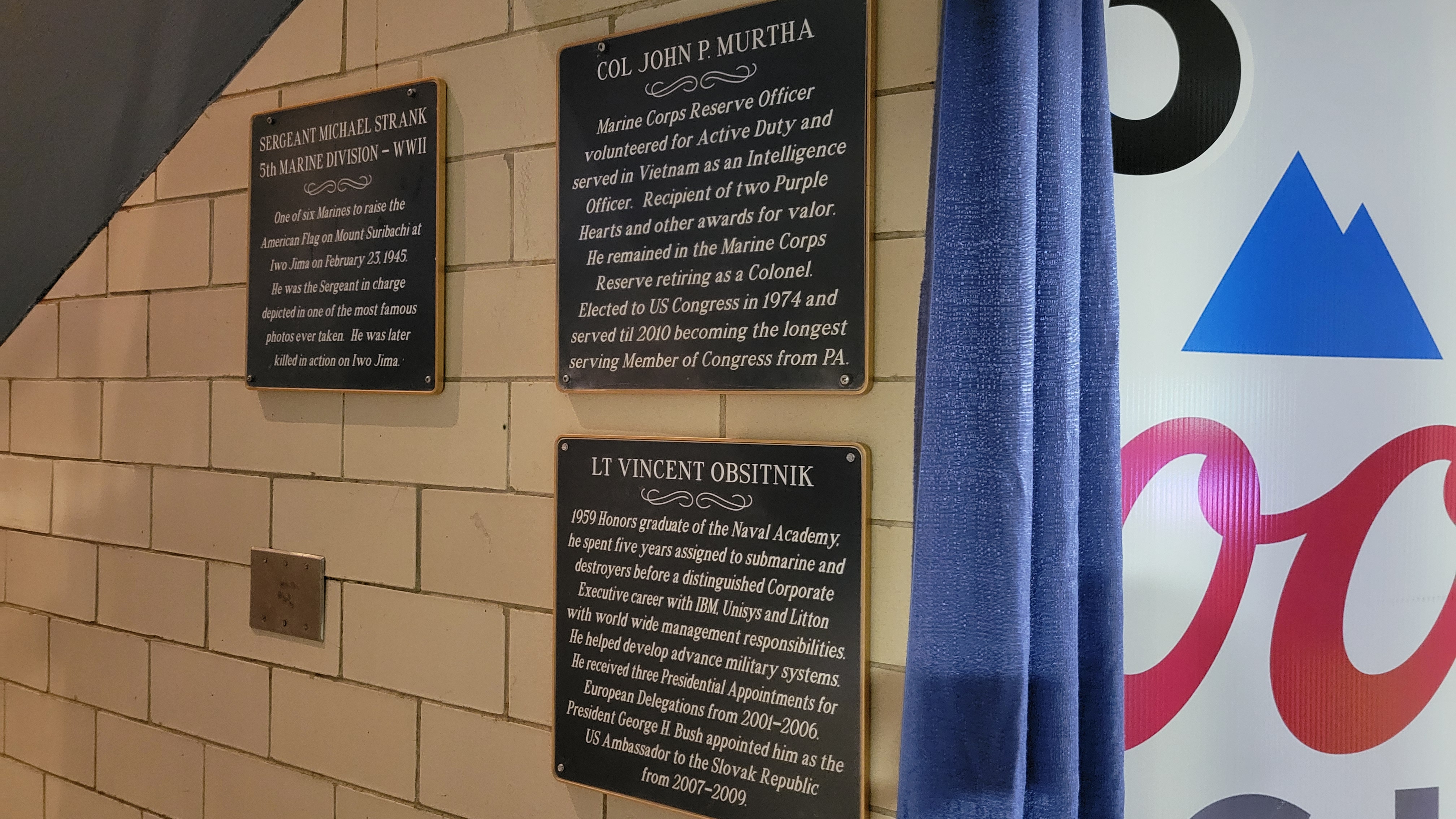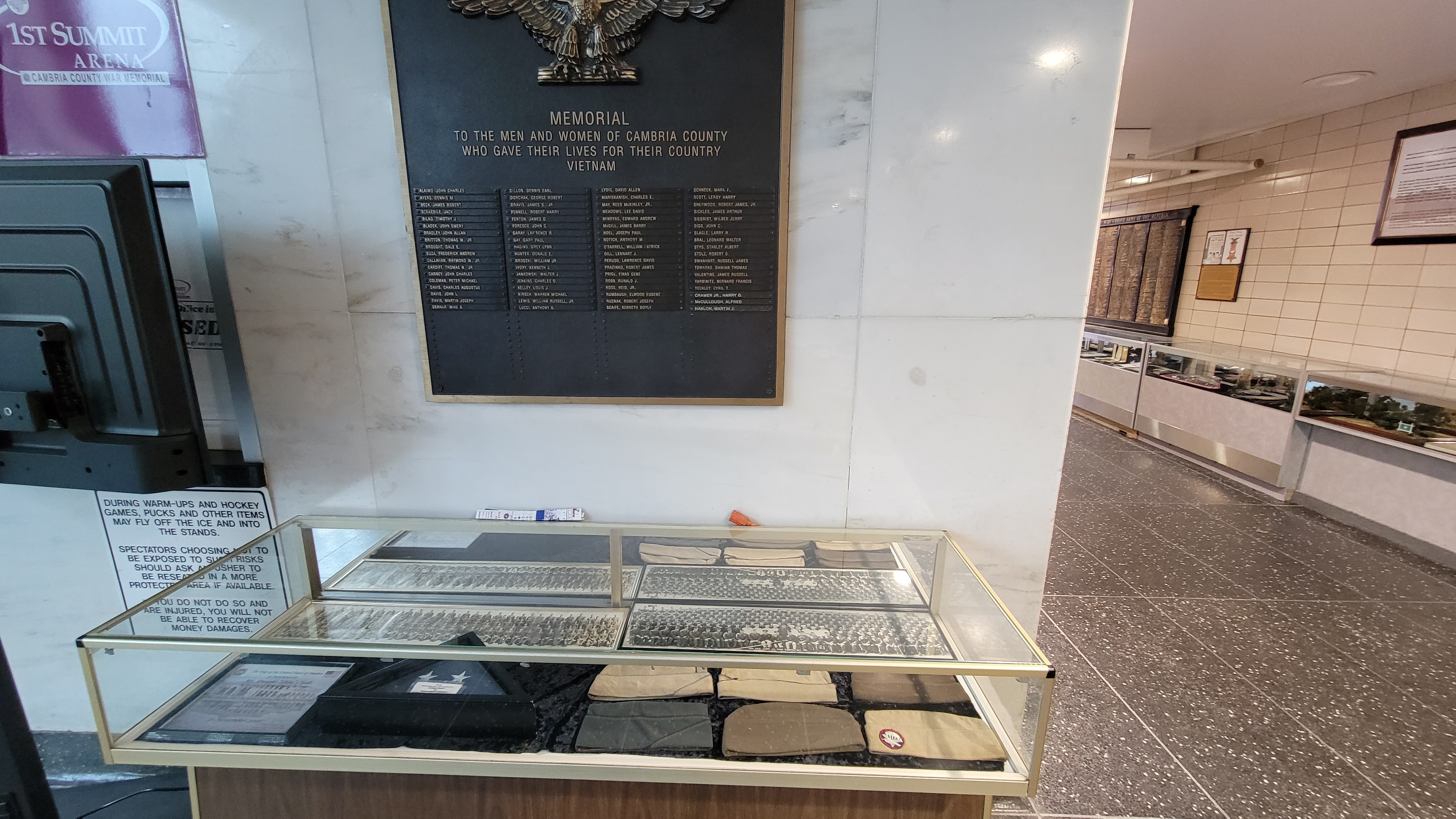 Johnstown certainly has the “War Memorial” part of this building down as the amount of dedications to area veterans is more than impressive. Flags, statues, plaques and mementos can mostly be found in the opening lobby. Even as you walk into the main part of the arena, you’ll see three veterans described and honored through each concourse opening. While all of that is more important, on the Johnstown hockey side of things, the visibility of displays is lacking. This is a building with a long hockey history and it barely is acknowledged. Outside three small retired numbers way up in the rafters, that’s all you’ll see for the Chiefs. “Slapshot” memorabilia is confined to the room for group events. And then you have the Tomahawks, who have two sad display cases: one sitting completely empty and the other with a lone, unmarked puck inside.