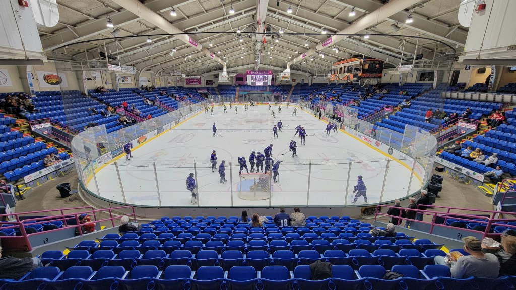 Seating goes around the rink with about 12-15 rows in each section. What’s nice is that the bowl is at a steep angle and that depth helps with sightlines. Because it’s a small building, you’ll see many prefer the top rows so that the boards aren’t in the way and the view is better at the other end. The bowl is more of an octagon shape and that means you don’t get a nice curve around the corners, thus seats themselves are facing straight ahead at the goal mouth. Chairs are blue and comfortable. Four suites are carved into one of the upper sides, while at floor-level is a group premium section. There are some cool elements speaking to the age of the building and the most notable is the gondola press box hanging over the side seats. It speaks again to how confined the arena is, but it’s an interesting piece, along with the stairs to get there. In fact, you can see this feature in “Slapshot”. That press box is outfitted to look like a commuter bus from CamTran and it’s one of a billion advertisements in the War Memorial. I know bills need to be paid, but this is overkill and taints the ambiance of the arena. There are stickers on the heating pipes, Toyota symbols on every stair and commercials at the start of every beam. Oh yeah, there’s also 30 (I counted) ads on the ice surface.