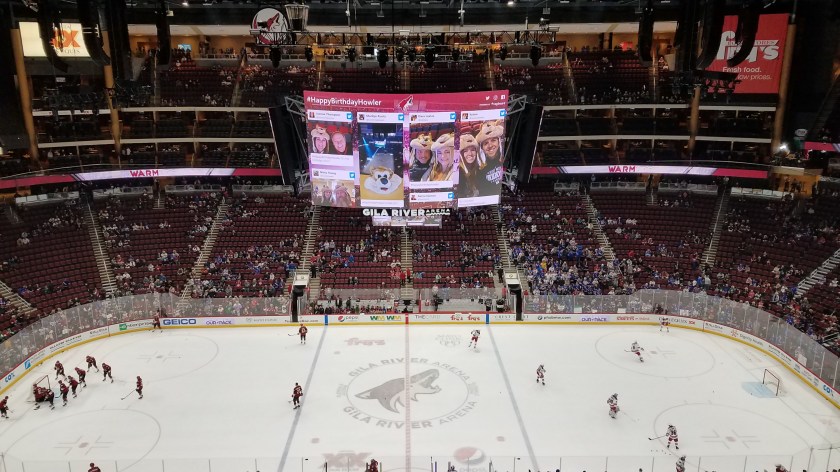 It’s been a long time since I’ve seen standard definition, 4:3 TV’s, yet you can find them all near the food stands here. In an NHL arena, no less!……What exactly is that odd circle hanging down a bit from the roof that has the Coyotes logo inside of what looks like a moon? I know it’s been around for a long time and it does add a bit of character, but I’ve never really got it…..The Coyotes spent their first several years in downtown Phoenix at the already existing facility that housed the Suns and it was not a good fit for a hockey rink….In 2014, the team changed their name from “Phoenix” to “Arizona”…..The Sound System was quite loud, too loud for my liking….It was the mascot Howler’s birthday and this brought an interesting assortment of friends to celebrate. Included: mascots for the Colorado Avalanche and the New Jersey Devils.