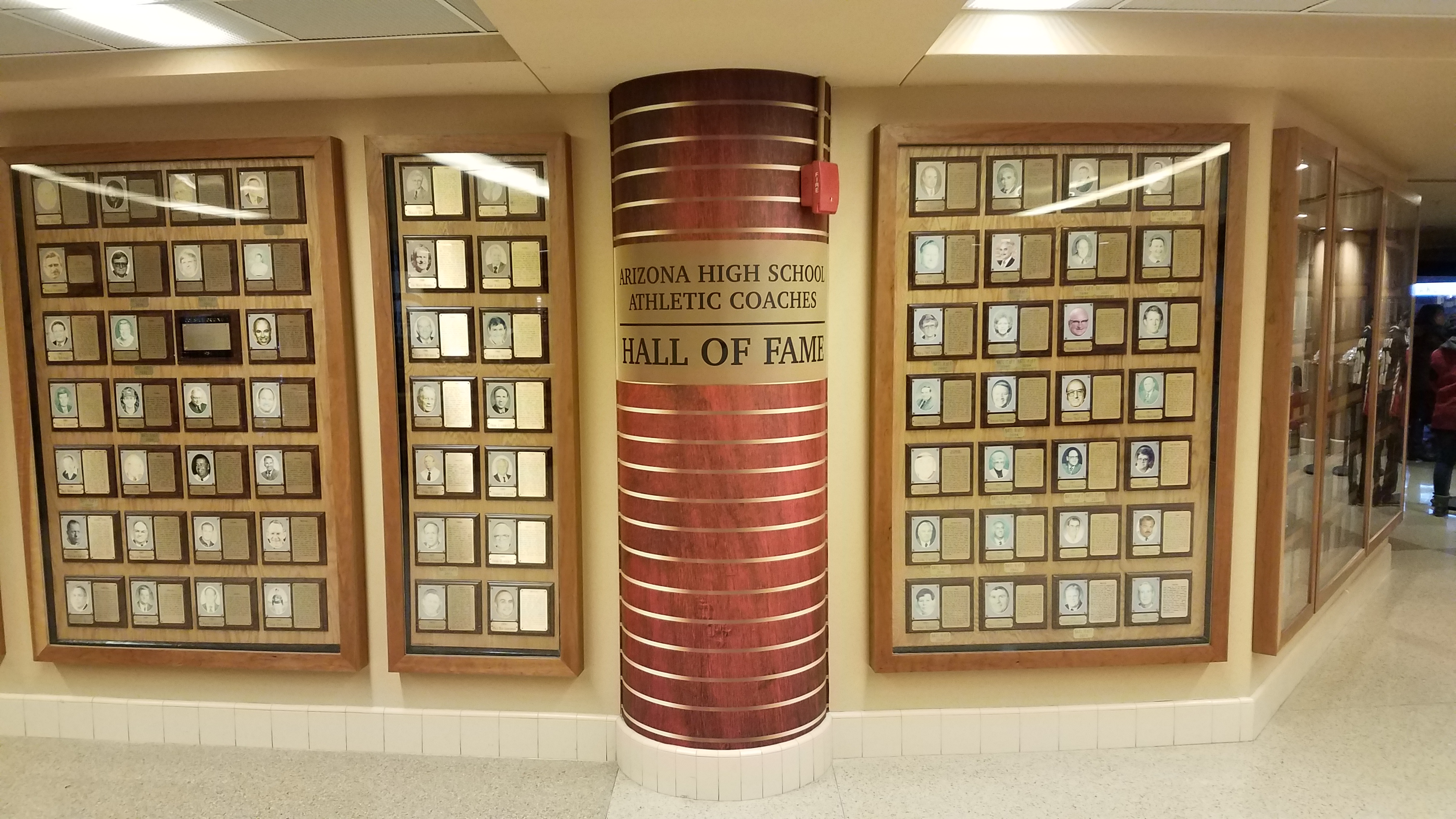 On the outside, human-sized bobbleheads are a cool touch. Disappointment follows as the lack of Coyote based displays is quite apparent. It’s only inside the rink where anything is found and that comes in the form of one lonely division title banner hanging from the rafters. At the top of one side is a “Ring of Honor” (not really a “Ring”). These are almost all players from when the franchise was in Winnipeg and now that the Jets are back in the league, it is bizarre to see the likes of Hawerchuk, Hull and Roenick up there. Wayne Gretzky has a spot too from his brief coaching days. At least Shane Doan will have his number retired and soon will be the first true Coyote to be honored (he’s to be added in a ceremony a month after my visit). Otherwise, other displays include some high school and college hockey jersey from around the state in the concourse, plus there’s an Arizona High School Coaches Hall of Fame. Take a look at some of the write-ups on the older plaques, they are kind of goofy.