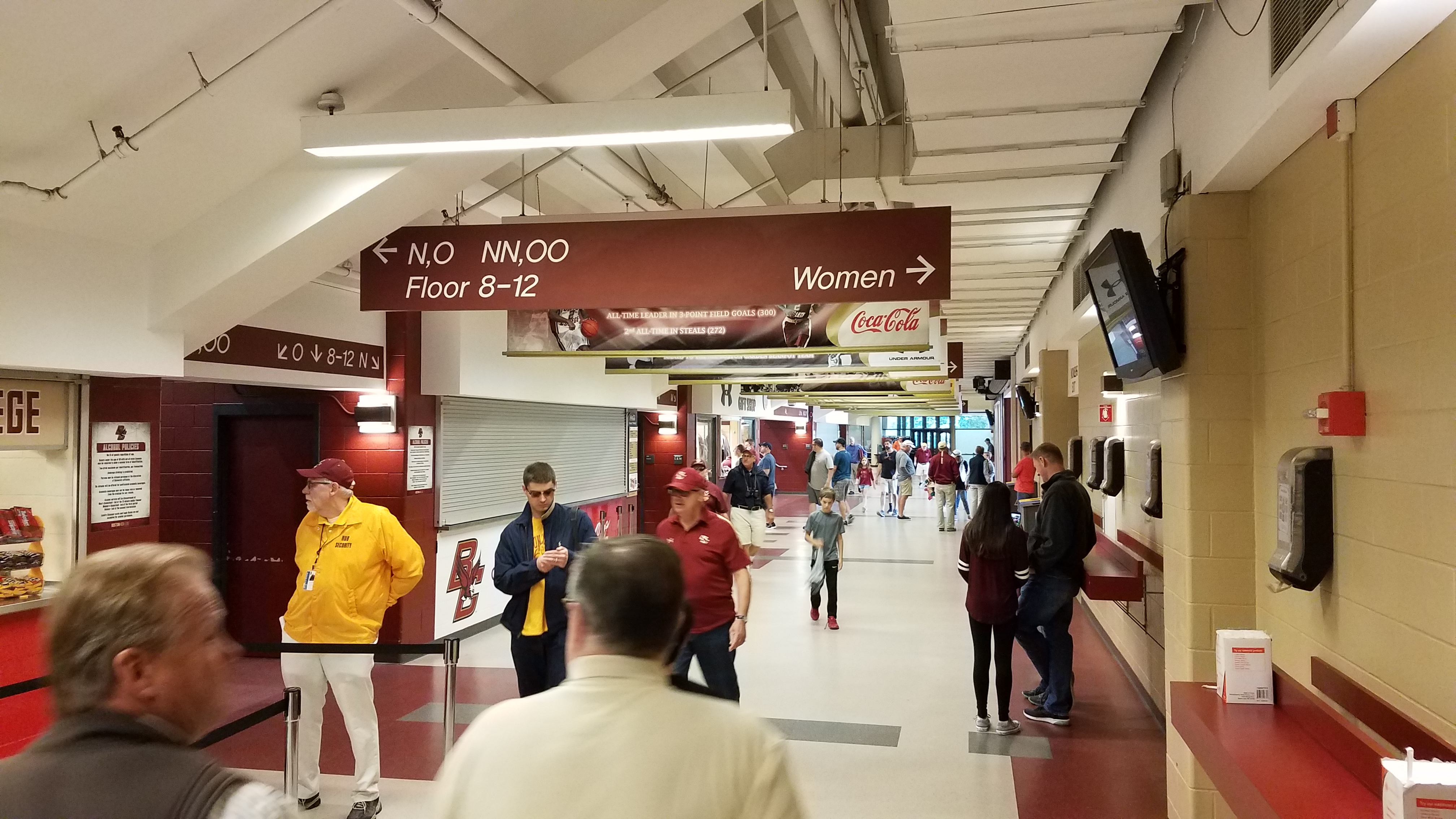 Each entrance has a small-ish lobby before leading to stairs into the main concourse. The area is well-decorated with walls that are gold and maroon to go along with a BC logo here or there. There’s also a nice amount of displays. The square concourse runs behind and underneath the seating on the sides, while the ends have an opening to the interior. Space is ok, but there is some level of crowdedness at halftime and especially at the end of the game. Concession lines can get lengthy and slow during the intermission break.