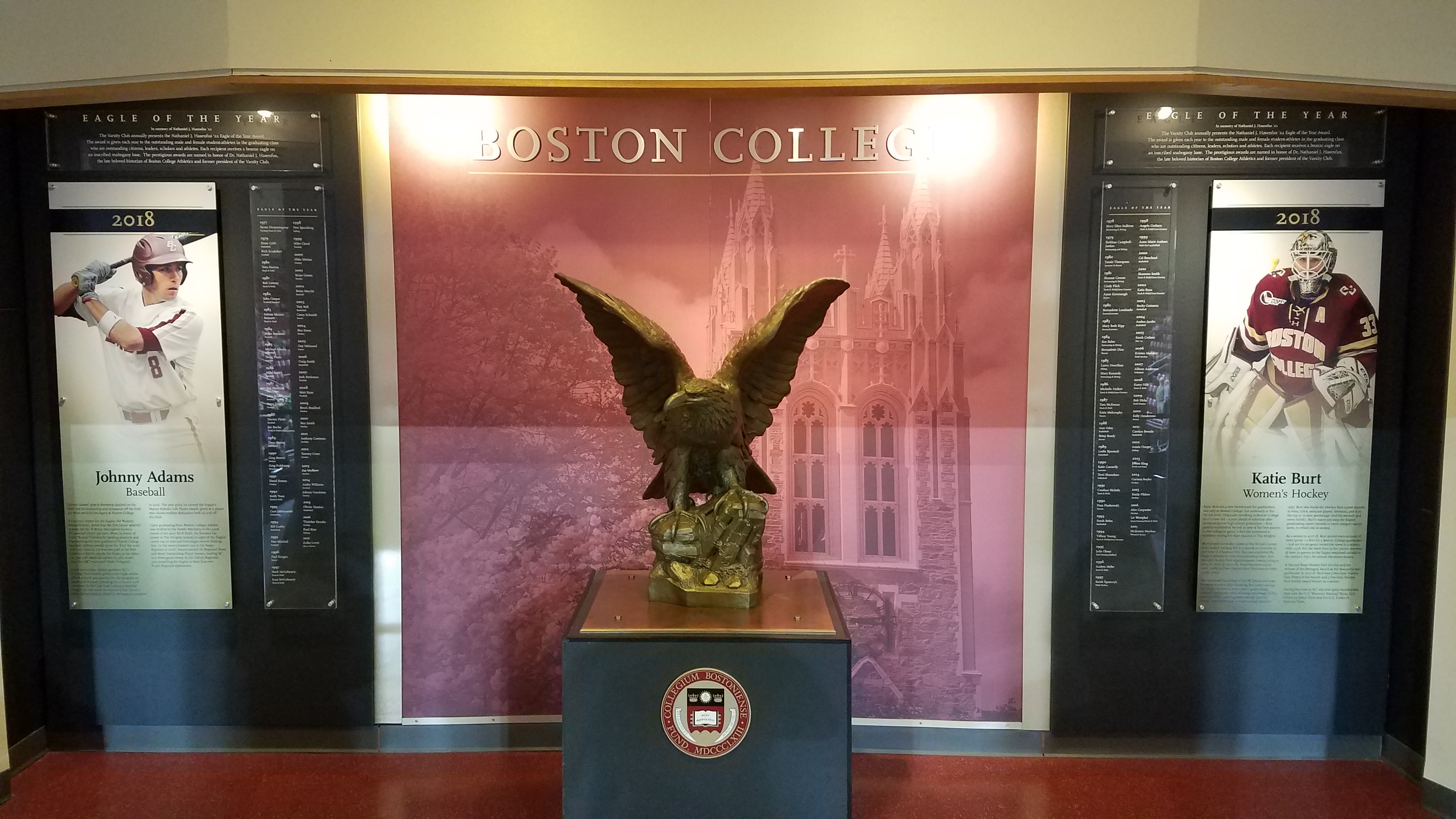 BC does quite well in the display department and my favorite section is the wonderful trophy cases behind one end that extend from the floor to nearly the ceiling. Tons of trophies, pictures and memorabilia honor the school achievements and the section is centered by a bronze eagle with the honoree for “Eagle of the Year”. At the other end is the Varsity Club Hall of Fame, a series of plaques honoring each member. Informational banners hanging down from the concourse ceiling do very well to detail the greatest moments and players in BC history. Inside the forum, the rafters are full of maroon and gold banners that highlight individuals at the ends and team championships for basketball and hockey in the middle. The team banners are hard to read since there are beams in the way and some get stacked behind each other. Back in the concourse, BC also has a “In The Pros” section and a display called “The Heights of Success” a clever play on the nickname for campus and athletic stature.