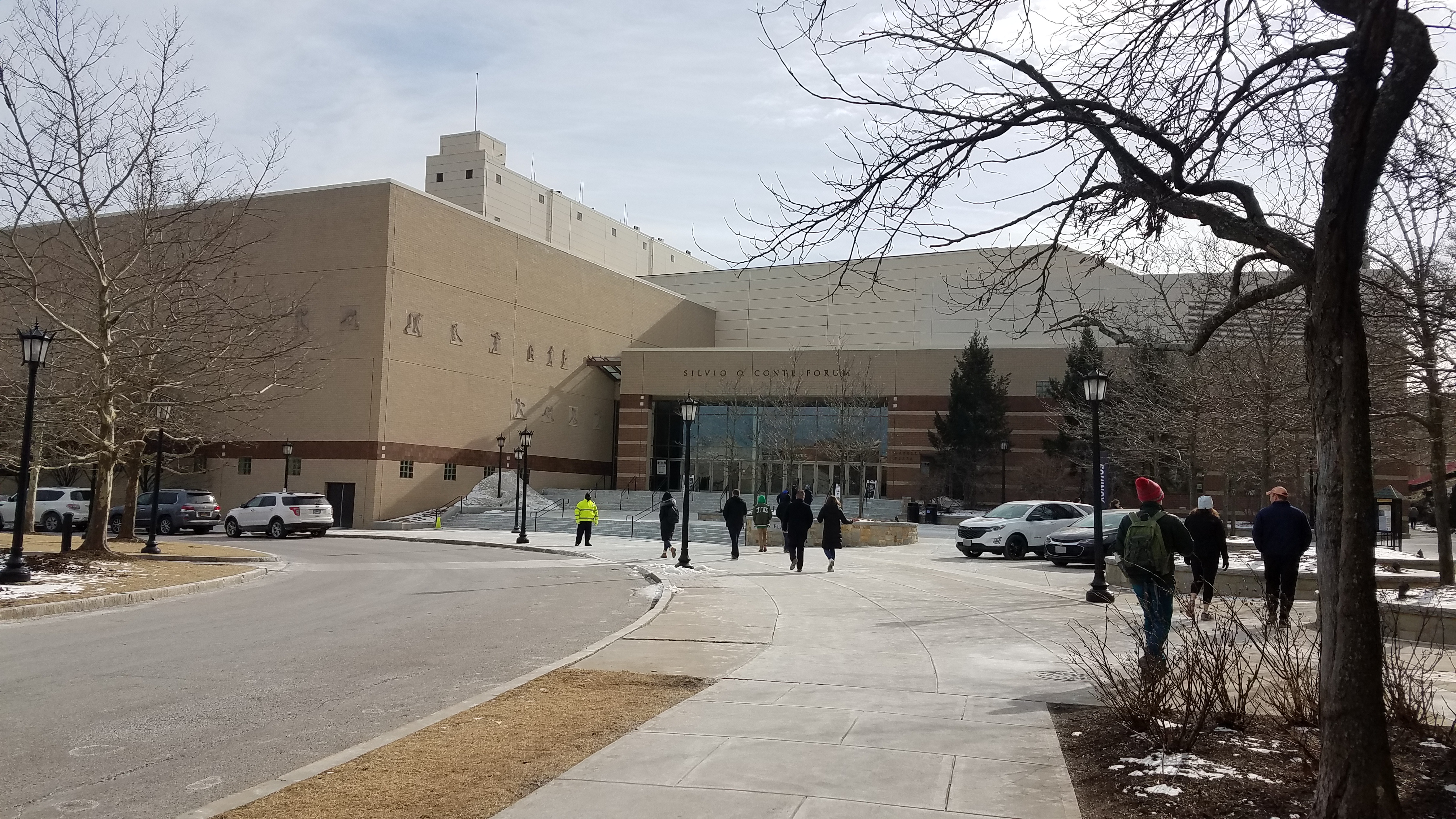 Conte Forum is adjoined by Alumni Stadium, while the east side of the building is quickly abbreviated as the hillside acts as a barrier. Thus, visitors have two looks to this arena, which is a drab brown and brick. Not exactly as appealing as the rest of the stone/gothic buildings on campus. “Silvio O. Conte Forum” is inscribed above each entrance and it is the south one that is a little more unique as the brick structure is slightly concave before reaching the doors. Plus, there is an eagle display out front. Small carvings of athletic poses can be found on some of the building and these cool visuals look much older than they really are.