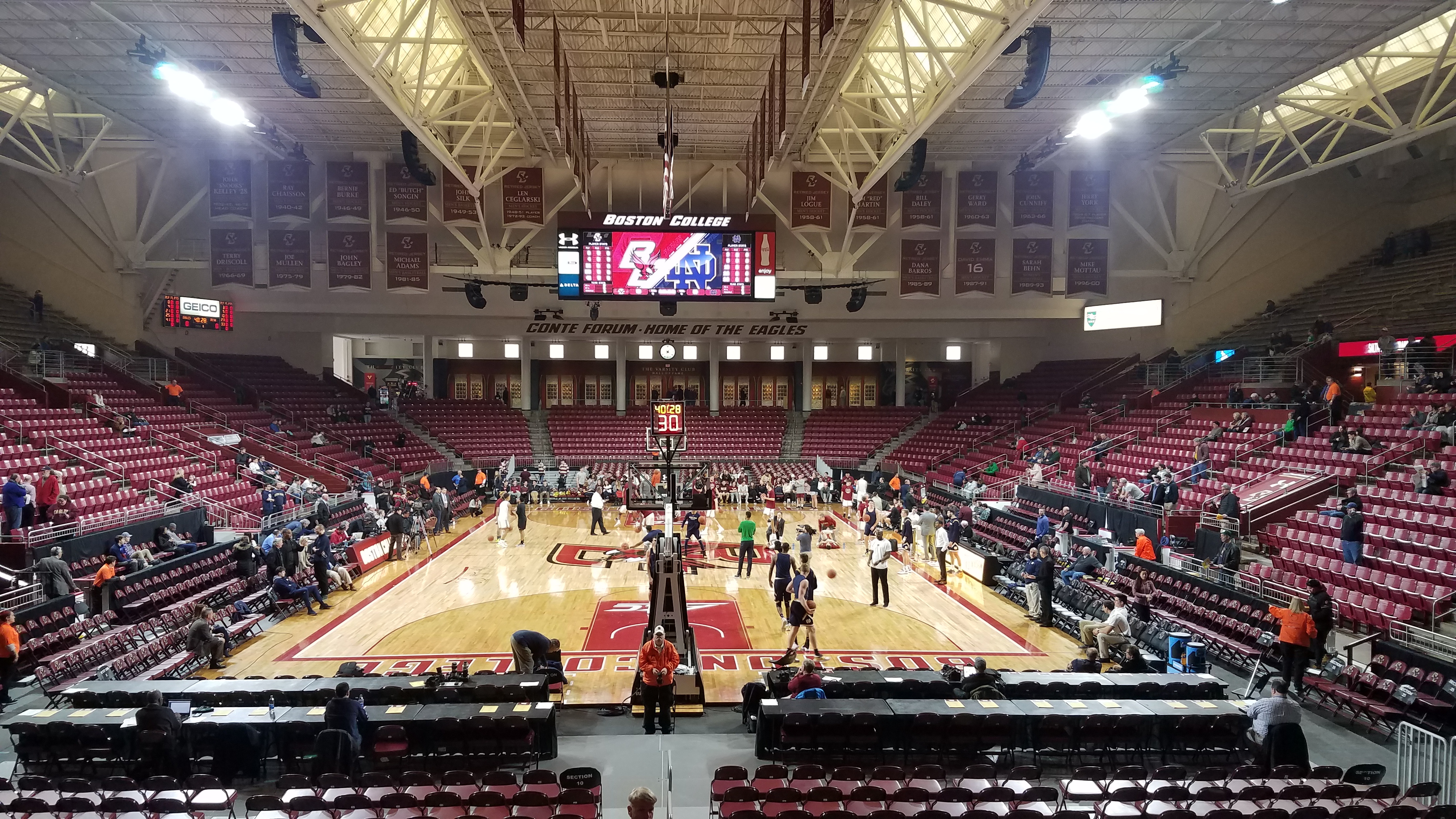 The Forum is named after Silvio O. Conte, a congressman and alum…..I may be getting old, but turn the music down! The speakers were way too loud and there were times I wanted to plug my ears…..BC’s most played and likely biggest basketball rival is Providence and the annual contest usually features a good amount of fans at the opponent’s arena…..The basketball team’s high point was a 1994 victory in the Tournament against #1 seed North Carolina. The low point: a point-shaving scandal in the late 70s….Eagles hockey has a remarkably storied history with several NCAA championships and plenty of trips to the Frozen Four. They also play in Conte Forum…..You’re likely to see some “Superfan” shirts in the crowd and this gold apparel trend started in the 1990s thanks to Jeff Bridge and Chris Millette…..It was warm in the building, especially in the upper seating. Make sure to wear a short-sleeve shirt, even if it’s cold outside…..Ushers don’t hold fans back during play, so there’s a lot of annoying jostling in-game.