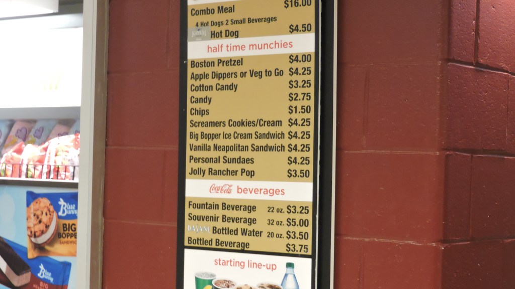 Most food stands offer what looks like a lengthy menu, until you actually read it and see that it consists of generic snacks like chips, peanuts and “jolly rancher pop”. The real food is weak as it is mainly hot dogs and pizza as a surprising omission is burgers and fries. There is a lesser variety here at the arena than what is seen at the football stadium. They do have Broaster Express, a combination cup of chicken tenders and potato wedges that were decent and a Barbeque offering (brisket or pulled pork). Common items favored in New England aren’t available. Beer at least featured choices including Harpoon IPA, UFO and Sam Adams.