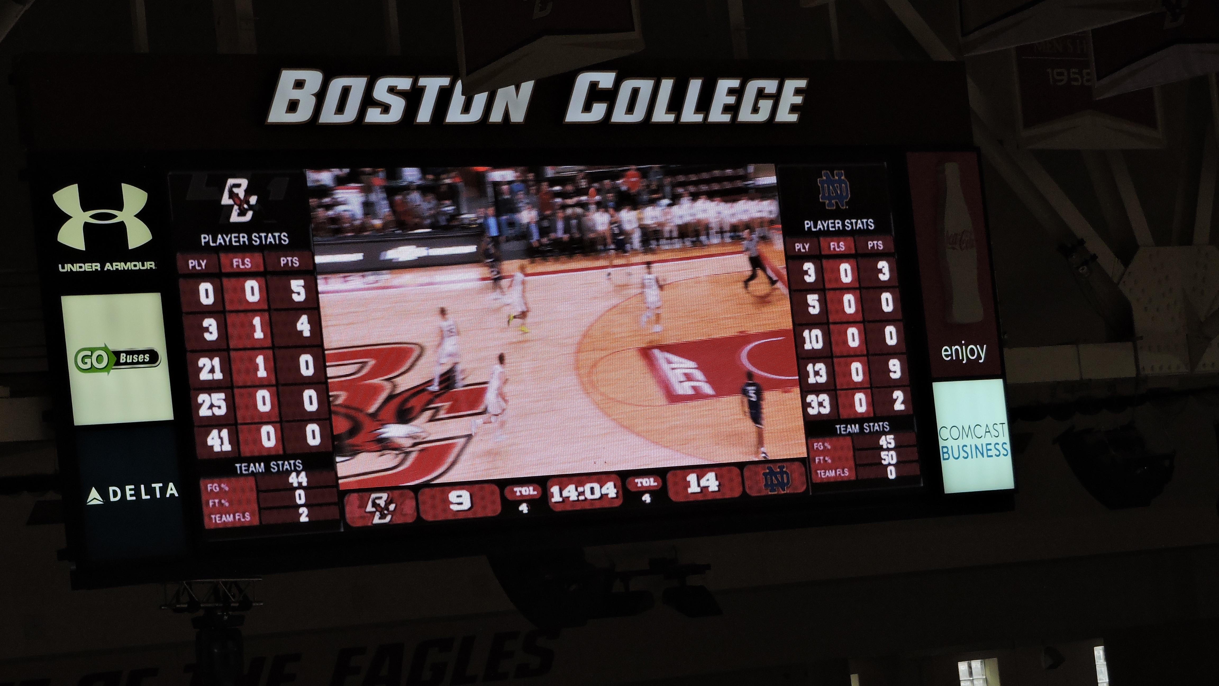 In place of a center-hung scoreboard is an American flag as the video screens can be found at the top of each end, which I always find awkward. There is a nice assortment of in-game statistics while about 60% of the board is devoted to live video. Clarity is great, however I found replays lacking. At the top is a “Boston College” wordmark and ads flank the sides.