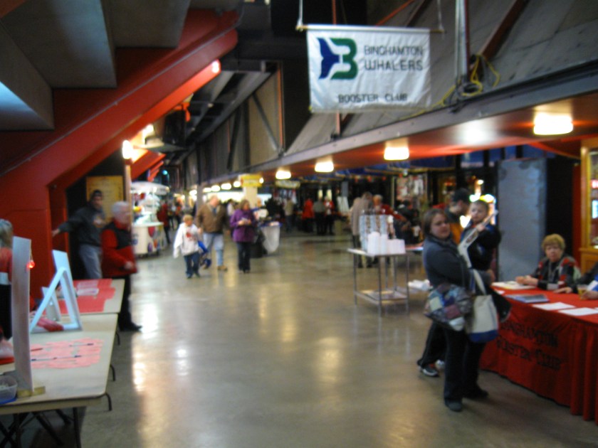 Binghamton is a city of 47,000 located in the Southern Tier region of New York, sitting at the confluence of the Susquehanna and Chenango Rivers. Those two bodies of water combined to devastate the city in 2011 as the area saw massive flooding from the remnants of Tropical Storm Lee. With not much entertainment in the area, hockey plays an important role, despite the rotating wheel of teams and leagues. There’s been the Dusters, the Whalers, the Rangers and now the Senators. AHL hockey came back to Binghamton in 2002 as Ottawa placed their affiliate here. Some decent players have come through the system and the 2010-2011 season saw the first Calder Cup come to the Southern Tier. Hockey has always been played downtown in an old and outdated bandbox of an arena. Opened in 1973, the Broome County Veterans Memorial Arena (a mouthful) can become an exciting and loud place for hockey. That was the case when I first came in 2002 and I was disappointed in the attendance and atmosphere dropoff upon returning a decade later.