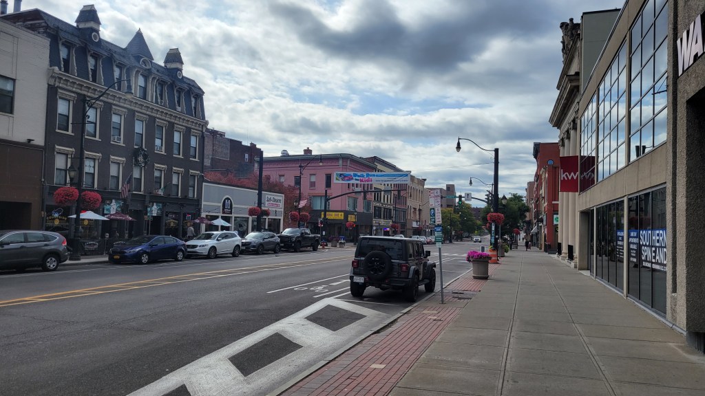 The arena is downtown, just a few blocks from each river. The immediate surroundings are somewhat drab as general office buildings include the Binghamton’s highest skyscraper: the State Office building. At 18 stories, it very much looks like it was built in 1972: square, off-white and basic windows along each row. It was known as Toxic Tower for awhile after an accident contaminated the building with PCBs, closing it for 13 years. On a better note, just head a few blocks north on State Street for a livelier part of Binghamton. The architecture is much more pleasant and there are a surprising number of bars and restaurants to check out. That continues on nearby Washington Street and Court Street. Otherwise, the city offers a few small museums and not much else attraction-wise.