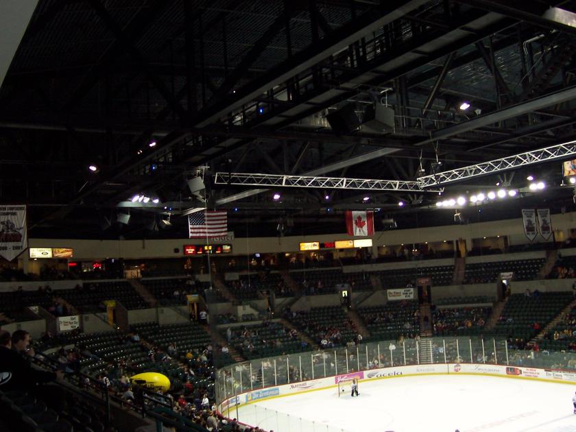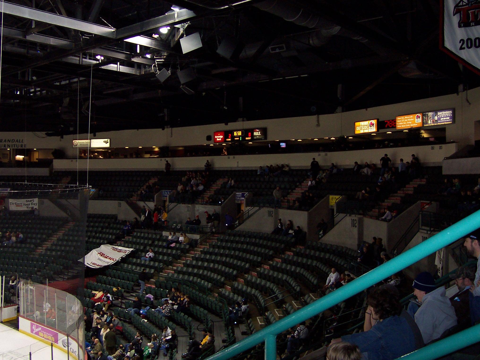 The arena is a modern facility with a standard, but decent design. There are two seating levels and the green seats are in a regular bowl shape with good sightlines. The lower bowl has the bulk of the seating and the upper level only has about 6 rows. Designers didn’t do a good job with actually getting to this second level as you actually climb stairs from the concourse to the suite level and then walk downward to your seats. Why only the ends have accessible stairs from inside the rink, I have no idea. The top of the arena is circled with 34 luxury suites and a club/restaurant on each end, which is the most specialty seating I have yet to see for a minor league facility. The press box is tucked between the roof and suites. One difference with the basic seating arrangement of this arena is that in some places in the lower level, two sections join into one near the ice. There are a few oddities to this place, but it otherwise is a good arena.