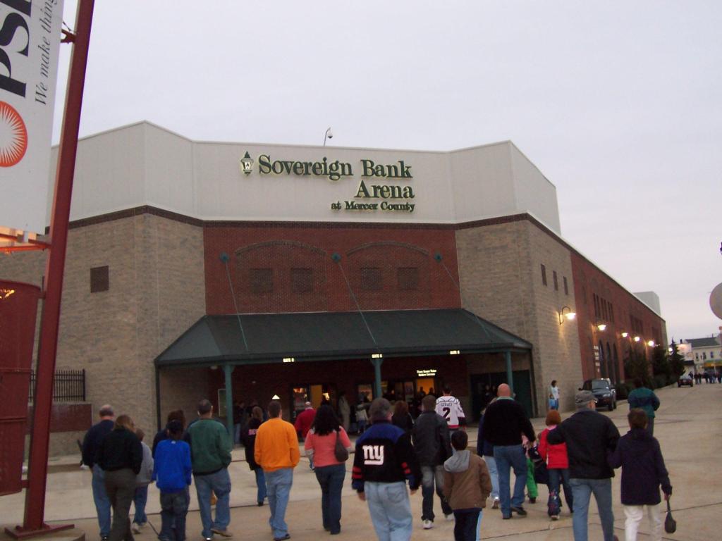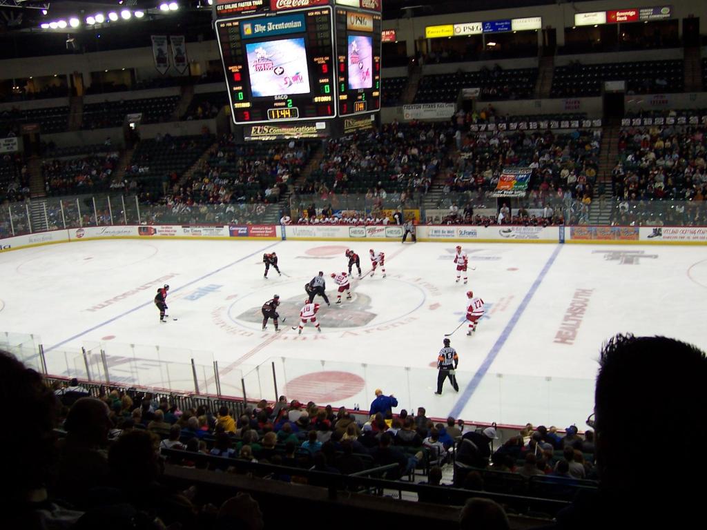 During a visit to Long Island, we made the seemingly short trip to Trenton to see Sovereign Bank Arena. However, I failed to account for New York City and New Jersey traffic, thus our travel time doubled to three frustrating hours in the car, which led to a scrambled visit and only half the game seen. Rookie mistake on my part. Three years later, after moving to the state, I made a return for a Titans game with a more complete visit. Trenton is the capital of New Jersey and located in the central part of the state, right along the Delaware River. The city is a small one with a population of 85,000 and despite the history here, it’s a place more known for a poor reputation of crime and run-down areas. The Titans hockey team arrived in 1999 as an ECHL franchise and the team immediately found success with deep playoff runs, including a conference title in 2001 and a Kelly Cup in 2005. Sovereign Bank Arena opened at the same time when the Titans began and it’s a decent, mid-sized arena for the team.