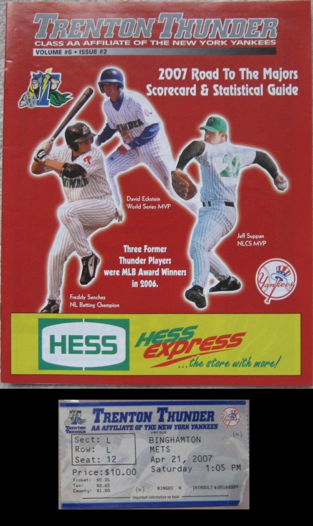 The capital of New Jersey is Trenton, located in the central part of the state, right along the Delaware River. The city is a small one with a population of 85,000 and despite the history here, it’s a place more known for a poor reputation of crime and run-down areas. Nearly 40 years after the city’s last professional team, baseball returned in 1994 as the London franchise in the Double-A Eastern League relocated to the Garden State. After a strange seven year affiliation with the Boston Red Sox (a team certainly not associated with the area), Trenton joined up with the Yankees in 2003. It was a beautiful early spring day for our visit in April of 2007 and then my return in 2013 was for a playoff game. The would go on to that one and then win their third league championship the following night. After some initial delays opening, Mercer County Waterfront Park debuted in 1994 and their home stadium is typical of a ballpark in the Northeast