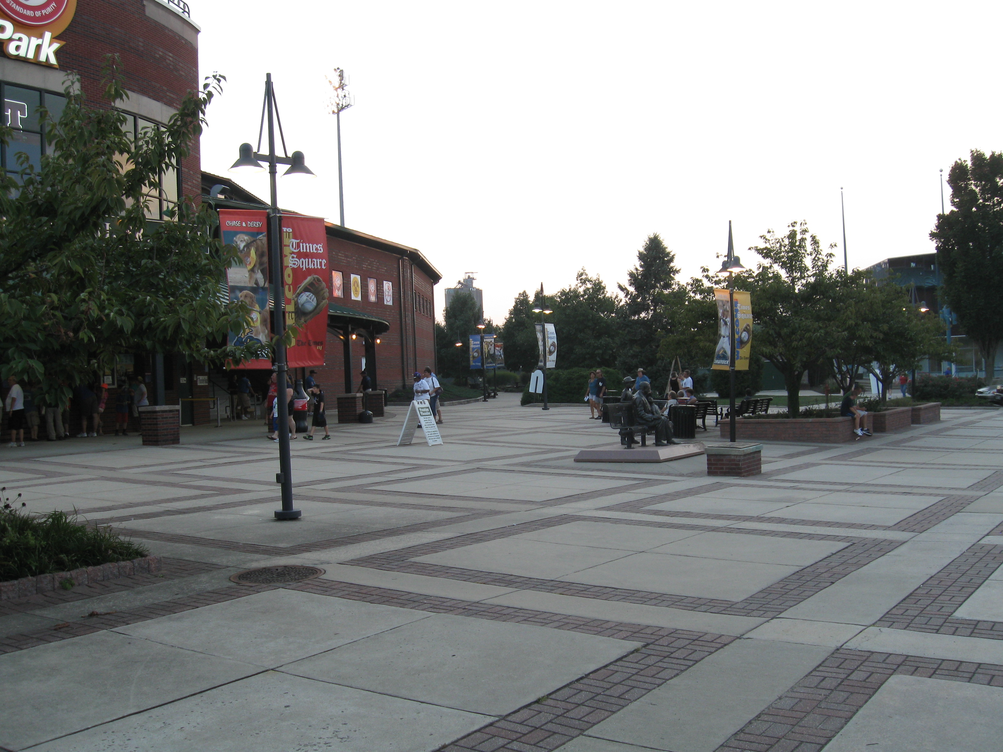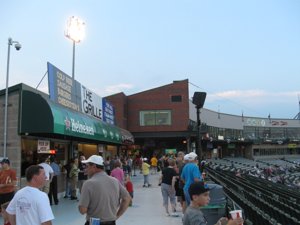 Waterfront Park features an exterior very common to 1990s ballparks: red brick and green roofing. At least this one has some purpose as the main entrance somewhat resembles a train station. Similar to the city’s arena. The box office sits under an awning, while above that is the face of the stadium, including the ballpark name. A semi-circle forms the shape of the stadium, which extends much more to the right of the main entrance. There is also a really nice and open plaza out front that eventually leads to a walkway down the river.