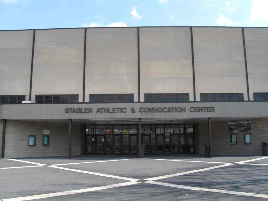 The facility is as simple as it gets: a square, grayish-whitish building. The concrete is visible on the walls and there are brown lines splitting the walls into panels. A sign saying “Stabler Athletic & Convocation Center” is located on the front of the building, just above the entrance, which is flanked by a couple ticket windows on each side.