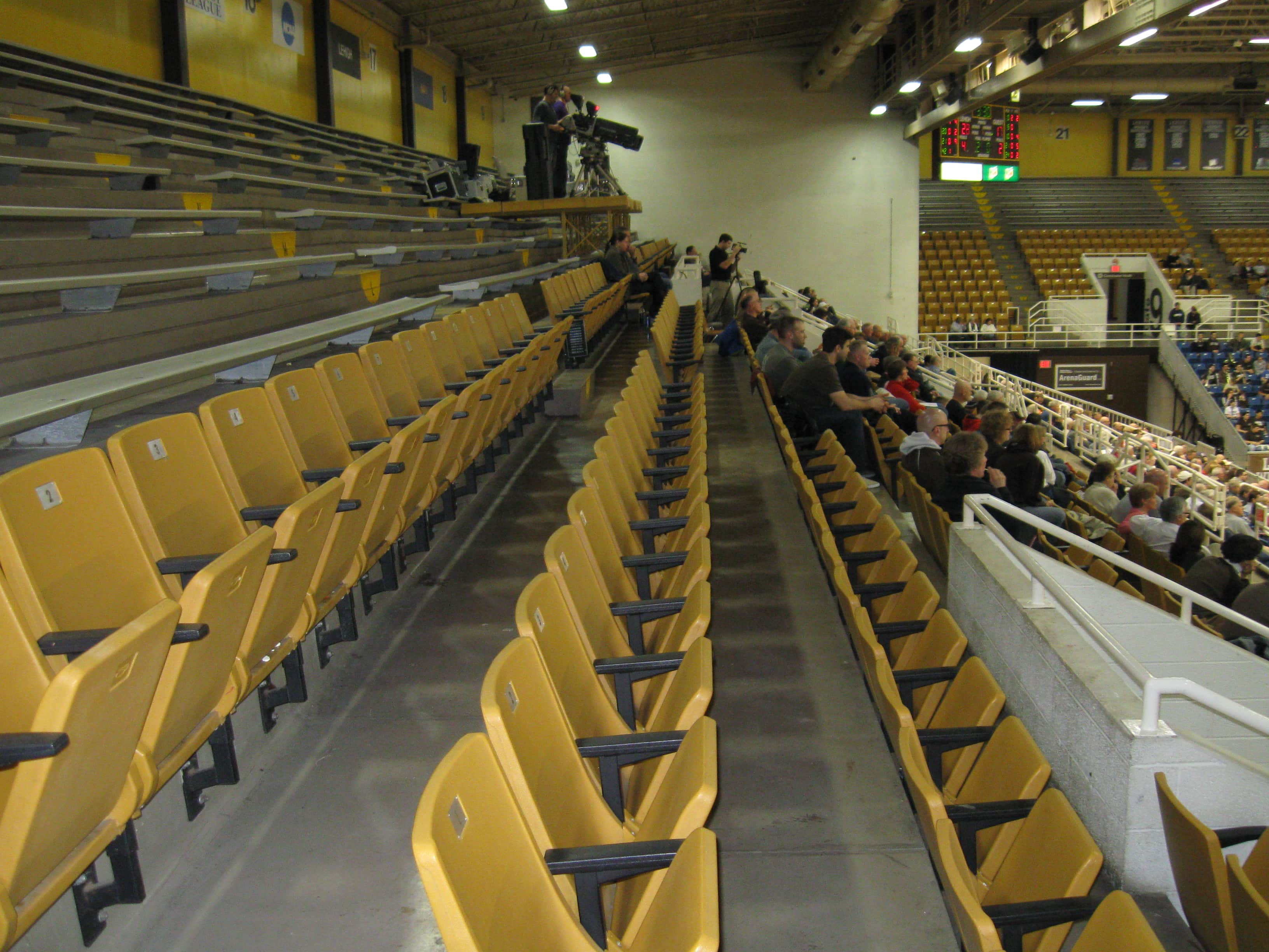 Stabler is not necessarily a terrible arena, it’s just not all that appealing as it speaks well to the era it was built. Each side has a flat section of seating that is a little further from the playing surface to be ideal. These gold seats are chairbacks in the front half and bleachers towards the top. Each sideline features a pull-out set of seating that is much closer to the game and these seats are blue with backs. Behind the basket are school cafeteria style tables and chairs that I’m assuming are reserved for special alumni. The rest of the end seating has a similar style to those seats on the sideline.