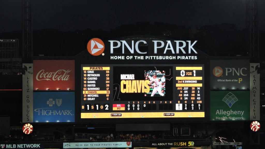 The scoreboard in left-field is simple but very good with decent size and clear video. At the top is a “PNC Park” sign, while the rest of the board is completely comprised of video and the layout during the game works well. What I didn’t like was the four giant ads on each side as it ate too much into the video screen. During my first visit, the intro video was very strange as they played a battleship animation of Pirates that went on way too long.