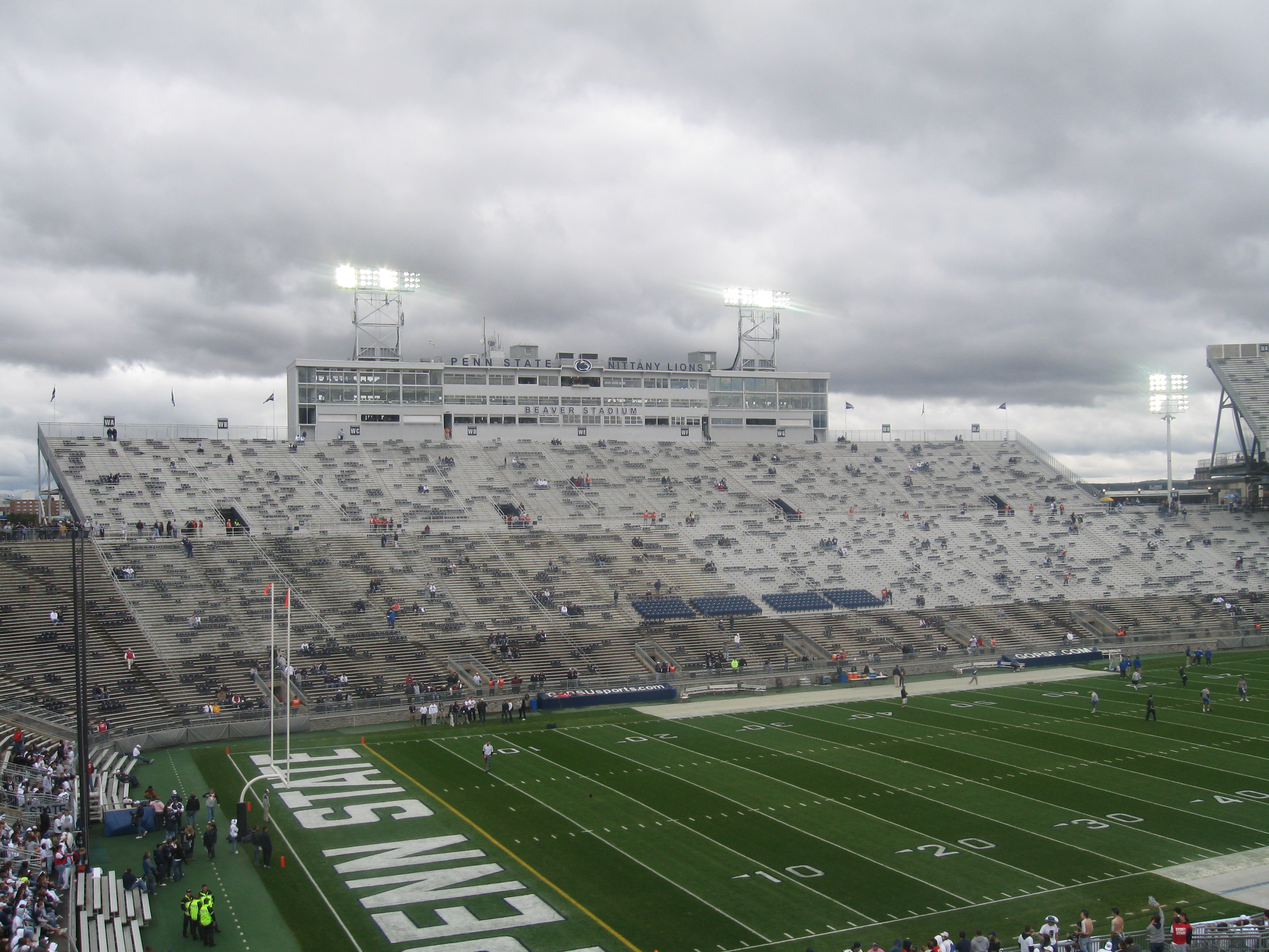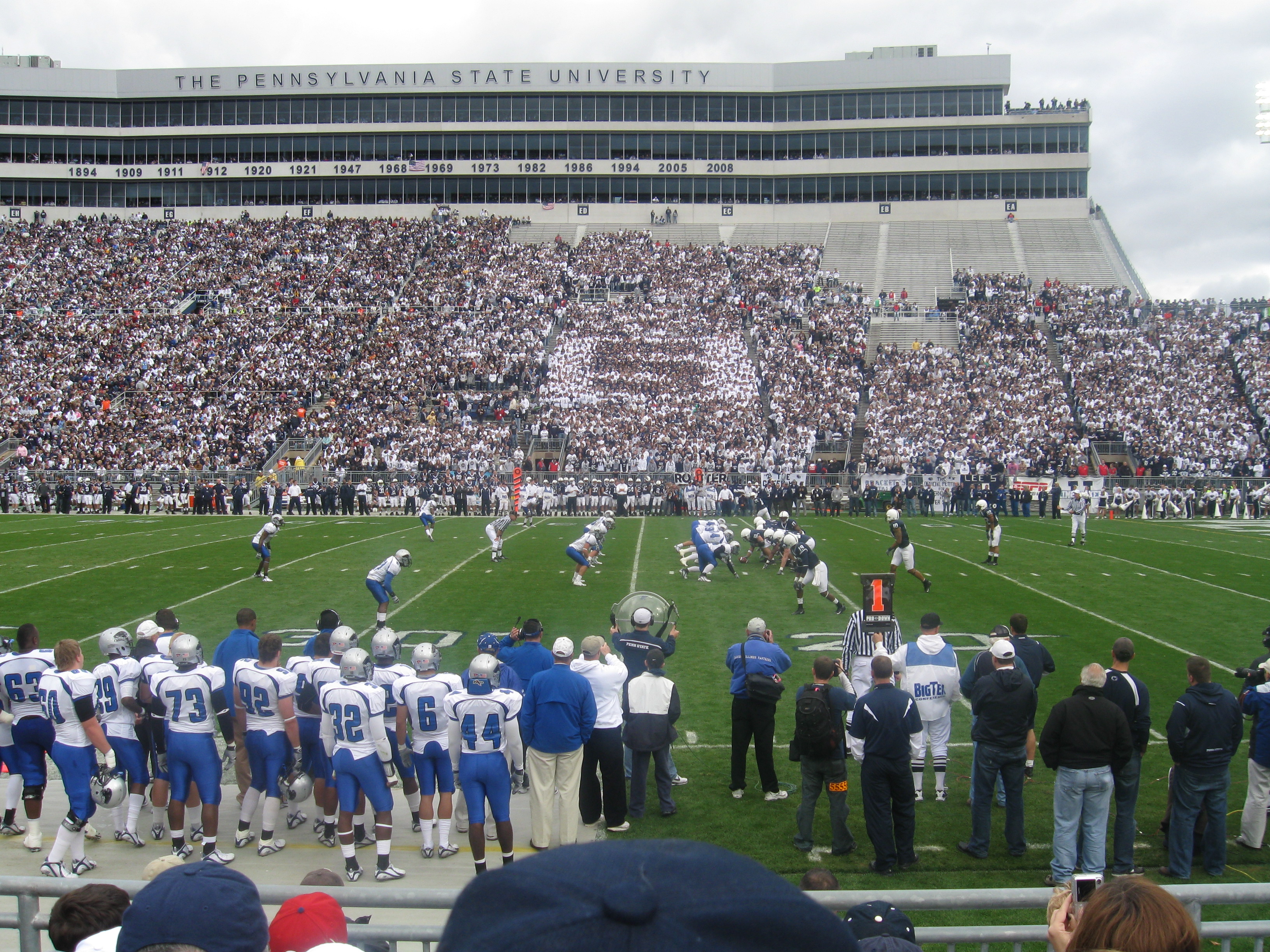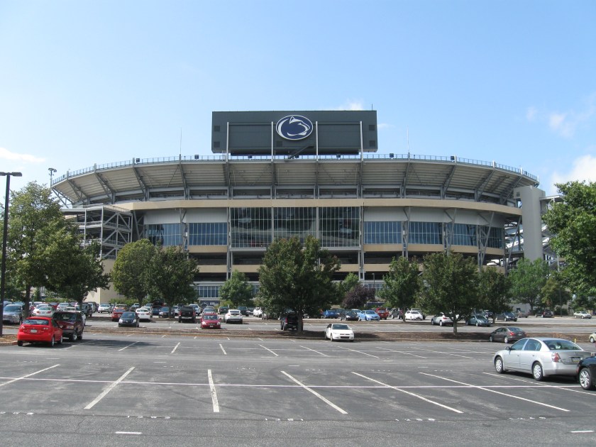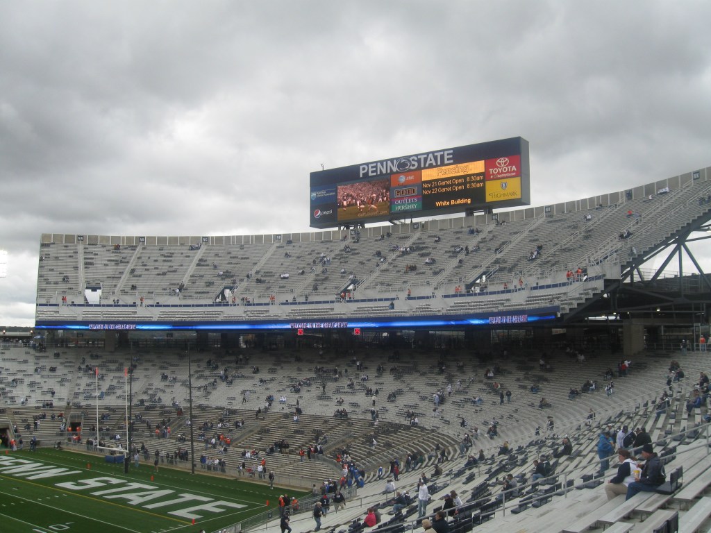 An acquaintance at my job gave me his season tickets and parking for this game as I could not pass up the opportunity to visit the largest stadium in the country despite the inferior opponent. Making the three-hour drive west was beautiful on this cool autumn day as the Pennsylvania colors were changing on all of the trees. My brother made the drive south from Rochester to meet me in the middle and continue on for the game. State College, appropriately named, is in the center of Pennsylvania and home to 38,000 people. The town and area is wholly focused on the Pennsylvania State University, which has more students than State College’s population and whose campus is nearly half the size of the town. Penn State is technically in University Park, but that is mainly just used for the mailing address within the school’s area. This huge state university is also generally one of the higher ranked schools in academics. The Nittany Lions football team has a very rich and successful history dating back to 1887. This includes over 800 wins and two National Championships with long-time coach Joe Paterno leading the way. He was still the coach at our game even at the age of 82, but that wouldn’t last much longer not because of age, but rather the very disturbing scandal involving Jerry Sandusky. Beaver Stadium has been home to the Lions since 1960, when it replaced an older version in a different location. Through expansions, capacity increased to over 100,000 and all those fans combine to make a terrific atmosphere.