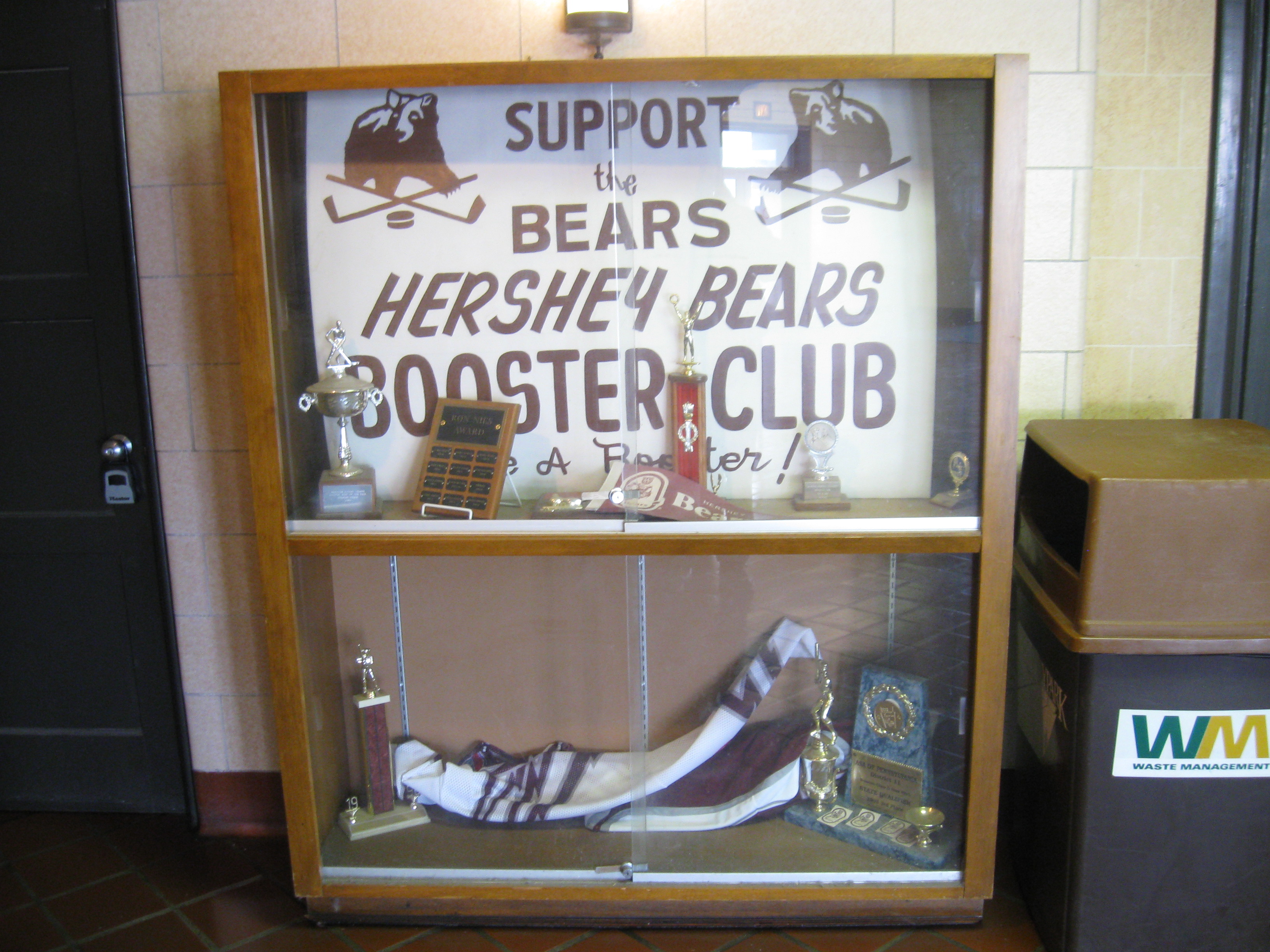 One of sports’ all-time biggest moments happened inside Hersheypark Arena. In March of 1962, Wilt Chamberlain scored 100 points in a regular season game with the Philadelphia Warriors. A historical marker outside the arena denotes this achievement, while inside there is a framed picture on one of the walls. The display includes a box score, along with that famous picture of Wilt holding a piece of paper with “100” on it. Inside the small hallways acting as a concourse, there is one reminder of the Hershey Bears and that is a case for the Booster club with some memorabilia. More Bears stuff is inside the rink and it is awesome that they kept Hershey’s Calder Cup banners. There are also four retired numbers that remain hanging from the roof. Lebanon Valley College didn’t have any displays, but the old Hershey items make up for it. Lastly and probably my favorite thing, they kept an old hand operated board at the top end that displayed the AHL standings for each conference