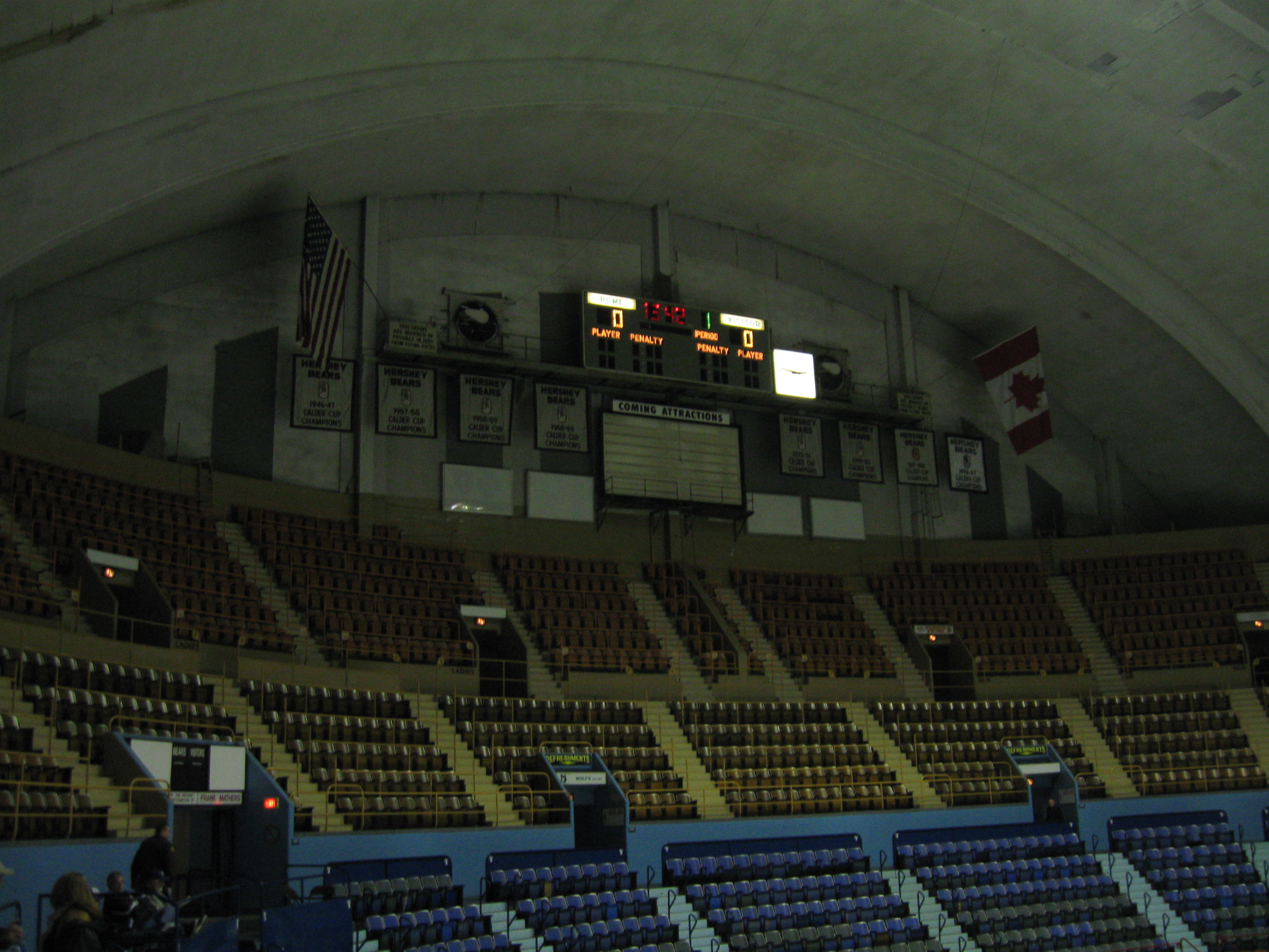 First of all, I have to thank you for putting all of these arenas on the web – I love seeing what they look like & have been stuck on this site for 3 days now. I too remember the Hershey Bears back during the days of our Richmond Robins – brings back great memories of my dad taking me & my 2 brothers to the Richmond Coliseum to see the Flyers’ top Farm team (Richmond Robins). My dad was from Philly & my Uncles up there all had Flyers season tickets, so it was cool to have a connection to the Flyers when they won it all (given that we got to see Dave Shultz, Oris K., Rick Mcleash (?), etc pass thru Richmond as they made their climb to the NHL to win several Stanley Cups). Anyway, I didn’t know at the time that the Bears played where Wilt the Stilt scored his 100 points, it was great to get a glance at this old barn! Thanks again, and keep adding moare holdings. BTW, thanks for including the Richmond Coliseum & the Diamond, but you really need to go see the VCU Rams in their Siegel Center – now that’s an atmosphere!