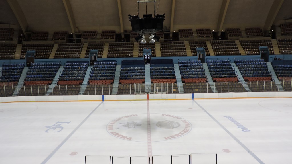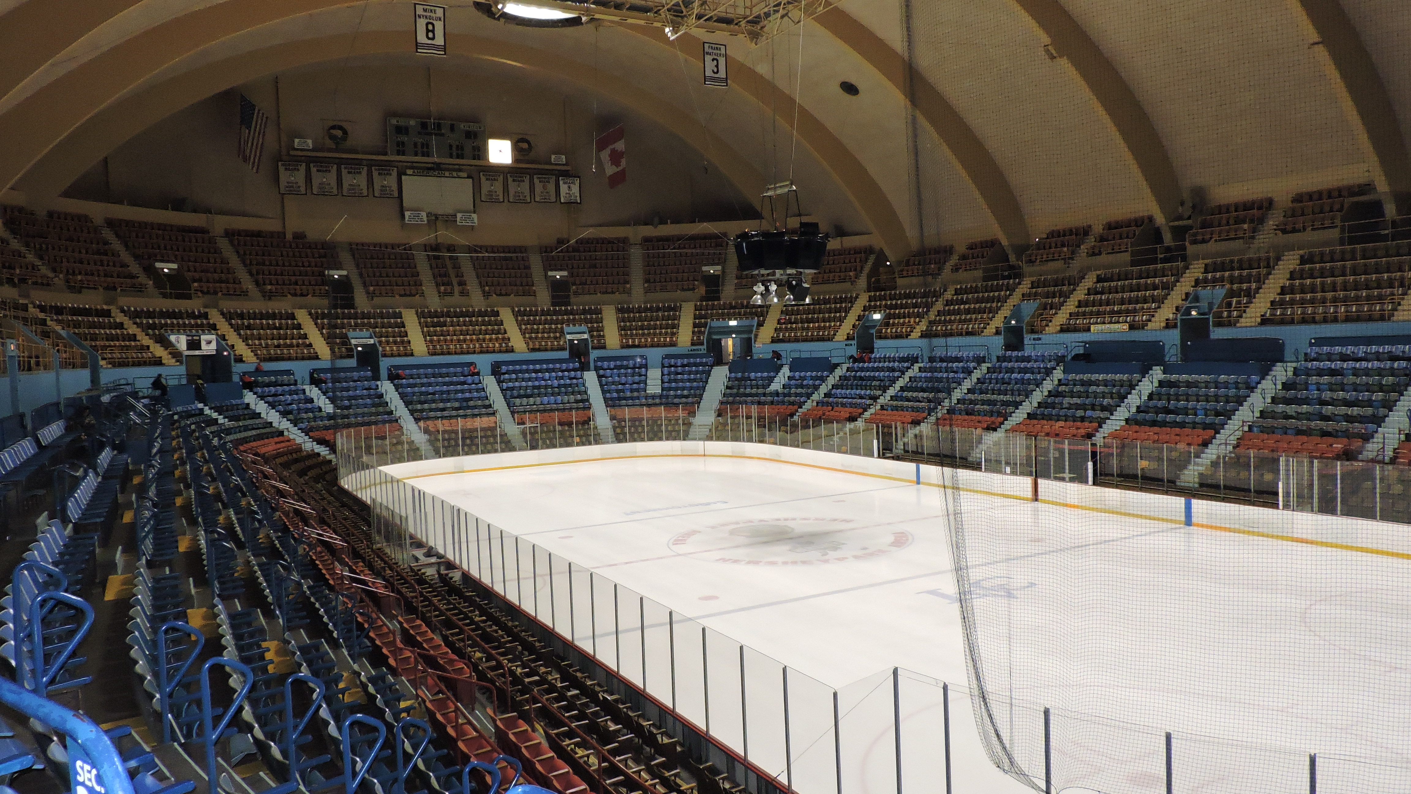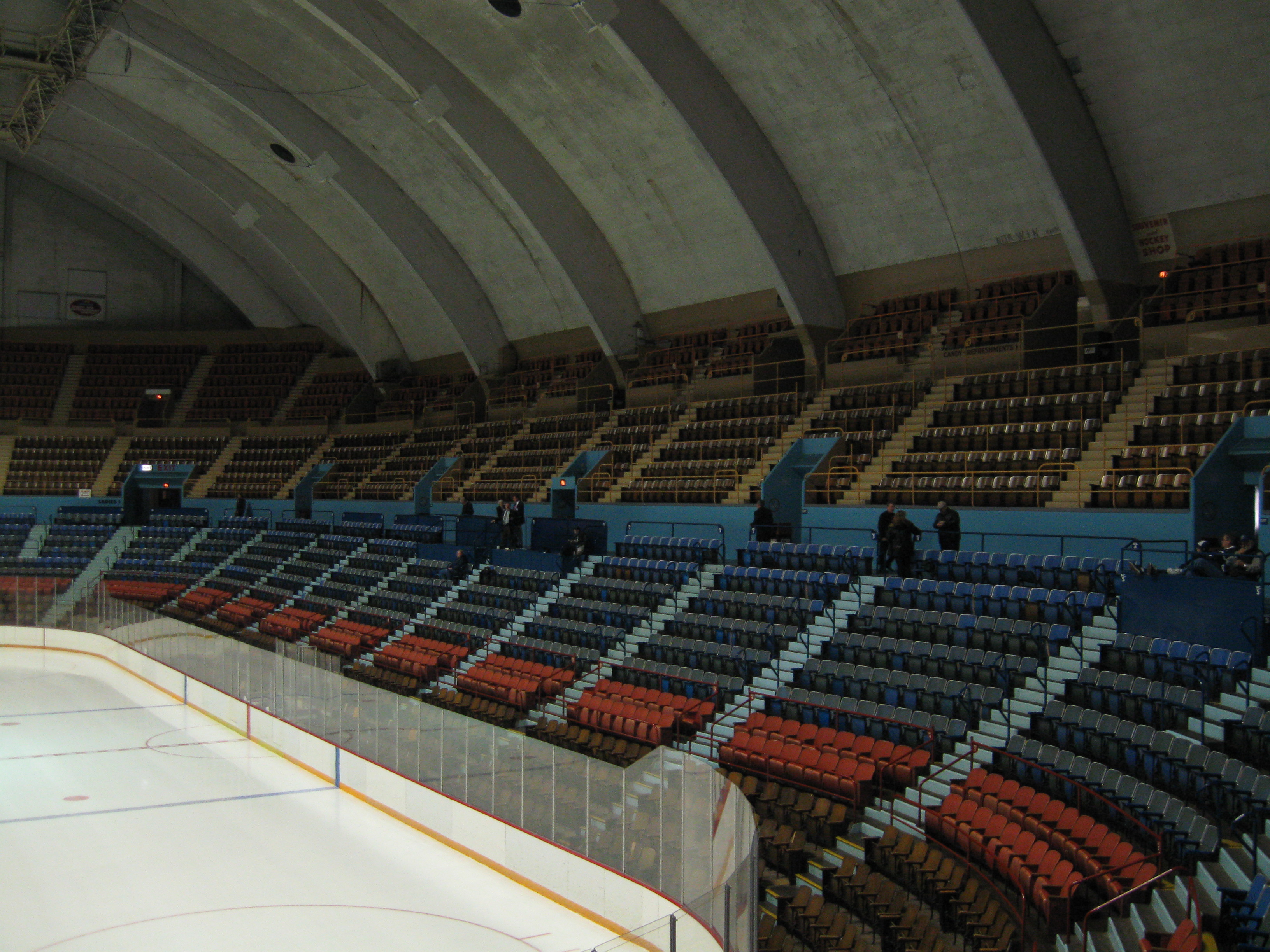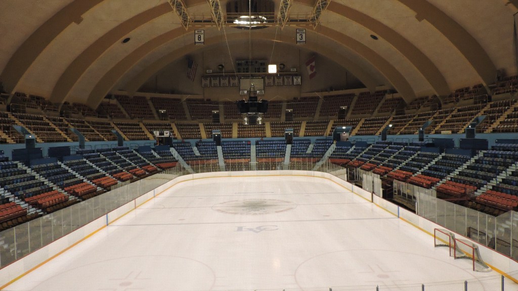 I can gush endlessly about what an old charm this place is. In the 1930s, the focus was hockey and providing the best sightlines for it…not how can we make money via premium seating. The arena is very intimate and the design is just an oval in the shape of the ice rink. There are three levels and the “upper deck” is incredibly steep, which leads you to being close to the ice. Seats are old-school as they are wooden (and close together) with four colors looking like they denoted pricing level: brown, red, blue & brown again. Of course, there are no suites here and the press box is literal in that it actually is boxed off and located at the top of the first-level seats. The signature concrete, arcing roof is quite discernable and the lights are grouped into three clusters coming from the roof. Comfortable it is not because of the tight seats, but the sightlines and remarkably historic nature for the building makes for a fantastic place to watch hockey.