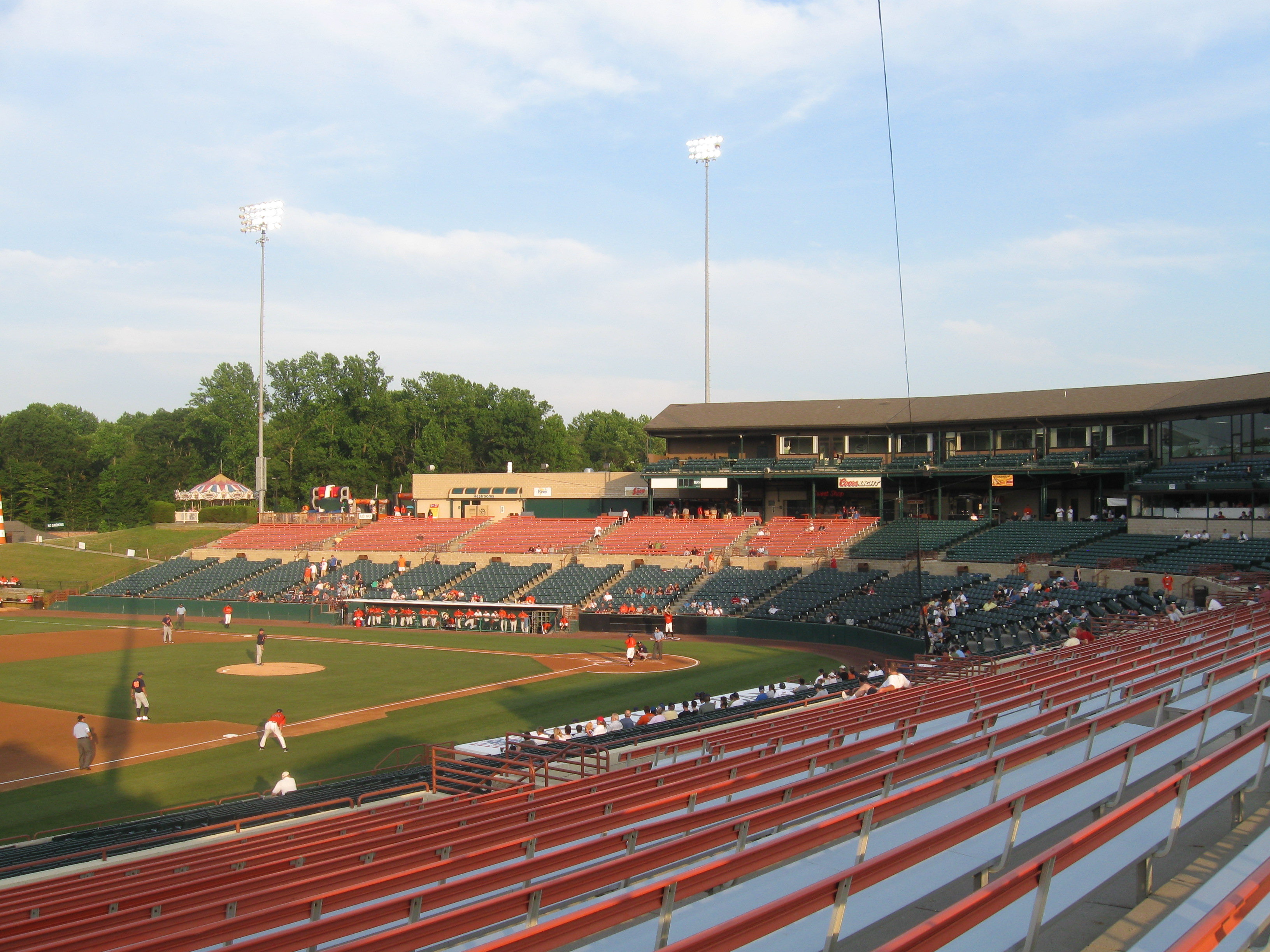 The stadium layout has a standard set-up with seats wrapping around to just beyond the infield. There is a walkway splitting the sections and it’s surprisingly deep with more seats than you would expect (capacity is 10,000). Unfortunately, several of the back sections are aluminum bleachers and rows seem to go up more horizontally than vertically, making you feel quite far from the field. It was not necessary to build it with this many seats. The rest of the stadium is green chairback. Suites are perched up over the concourse and in the back of the bowl behind home plate is the press box and the Diamond View Restaurant, which has both indoor and outdoor seating. Looking past the large ads over the outfield wall, an appealing view of trees greets fans. Grassy seating areas are found at the end of the seating bowl, while other features inside the stadium include a replica small lighthouse on the first base side and a carousel (all Orioles affiliates seem to have a carousel in their ballpark). Also, on the third base side is a large picnic area.